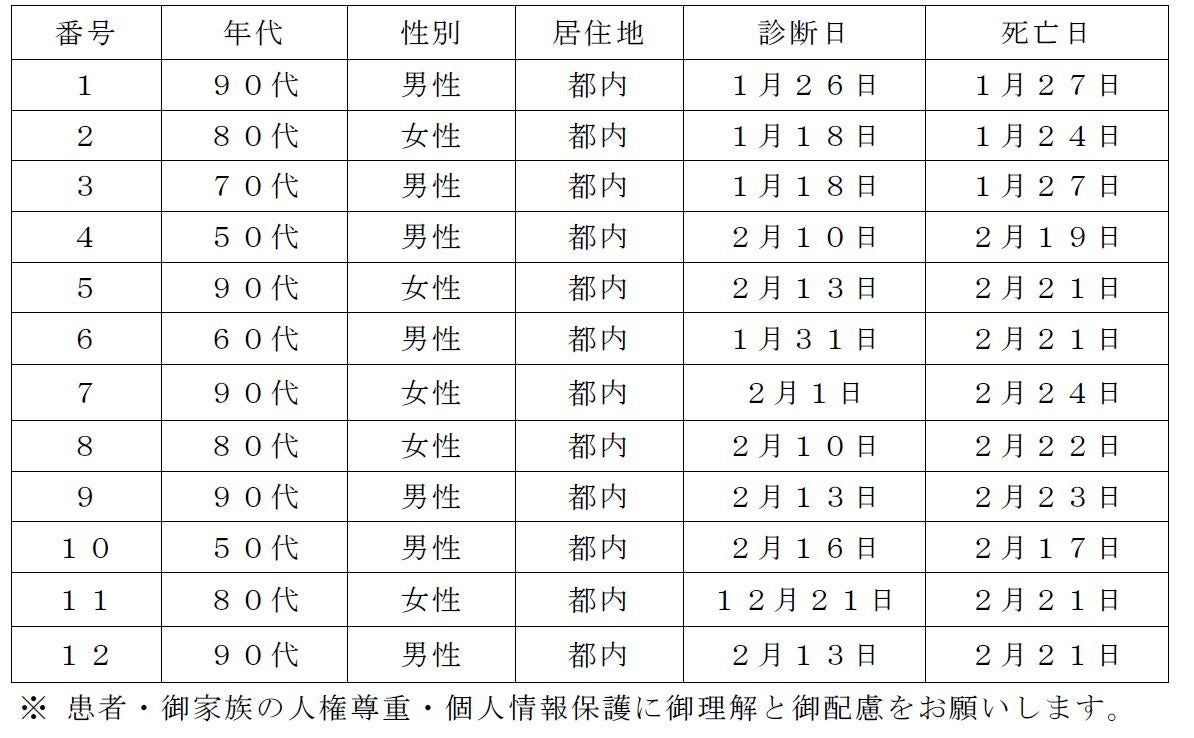 都内で新型コロナウイルスに感染した方が死亡されましたのでお知らせします。