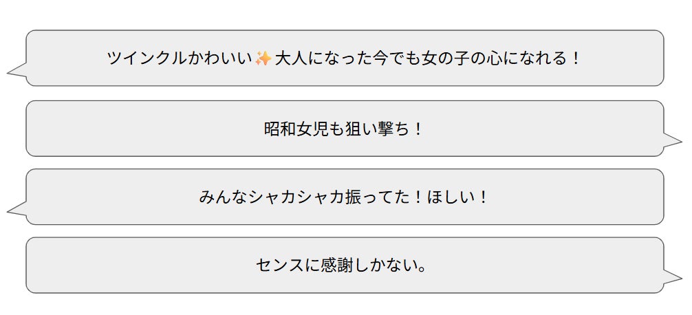 今回の3つのアイテムには、どれも動きがあったり、音が鳴ったり、キラキラの素材感であったり、ツインクルを手にしたときのワクワクした気持ちを商品からも感じてもらえるよう、トキメキポイントを盛り込みました。