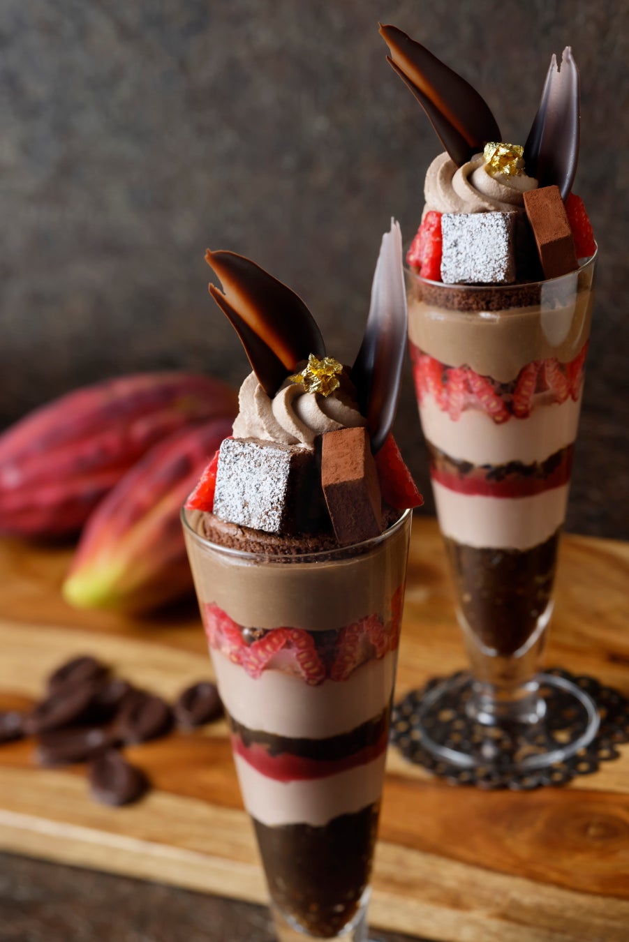 産地ごとの個性を感じながら、濃厚なカカオの風味とベリーの爽やかな酸味が調和する、至福のご褒美パフェです。