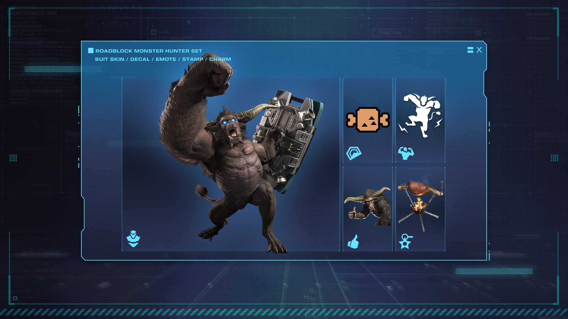 「モンスターハンター」シリーズの装備やモンスターをモチーフとしたスーツスキン、デカール、チャーム、スタンプやエモートが登場します。