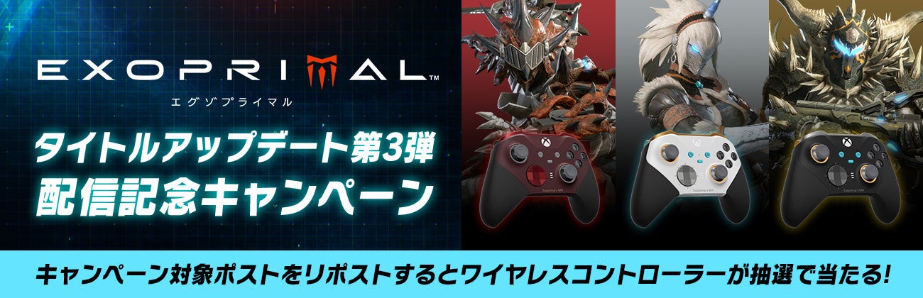 『エグゾプライマル』タイトルアップデート第3弾の配信を記念して、「Xbox Eliteワイヤレスコントローラー2 モンスターハンターコラボカラー」が抽選で当たるキャンペーンを開催いたします。