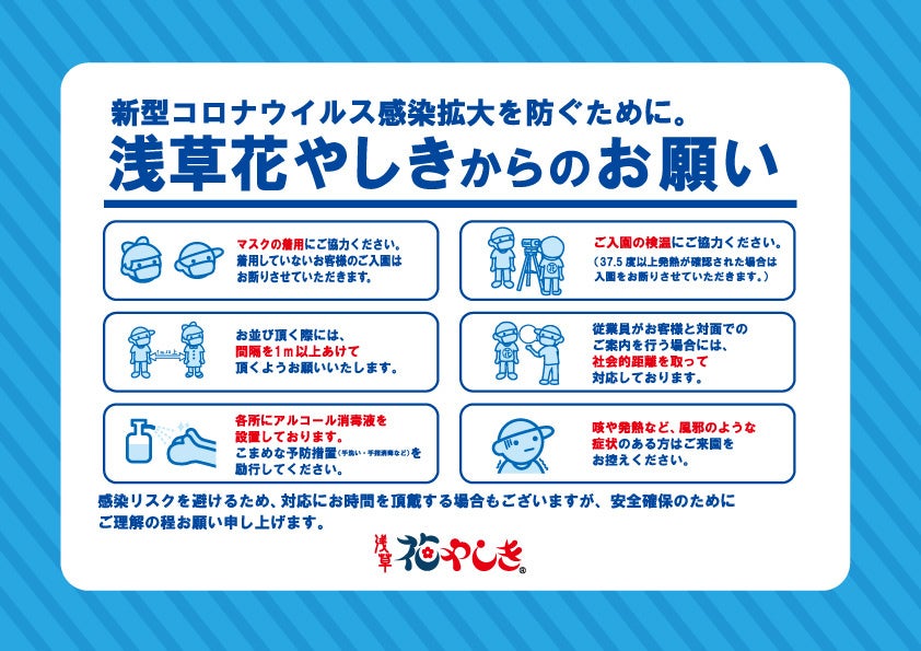 浅草花やしきは、政府の新型コロナウイルス感染対策の基本対策方針を踏まえて作成された「遊園地・テーマパークにおける新型コロナウイルス感染拡大予防ガイドライン」に則り、お客さまと従業員の健康と安全を最優先に努めて営業を行っております。