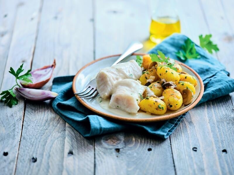 白身魚に、ジャガイモとマッシュルームのローストを添え、