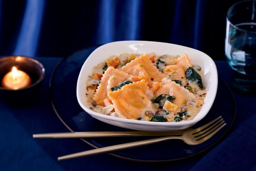 セージの風味を効かせたバターナッツペーストを包んだラビオリに、プルロット(ヒラタケ)、ポルチーニ茸、