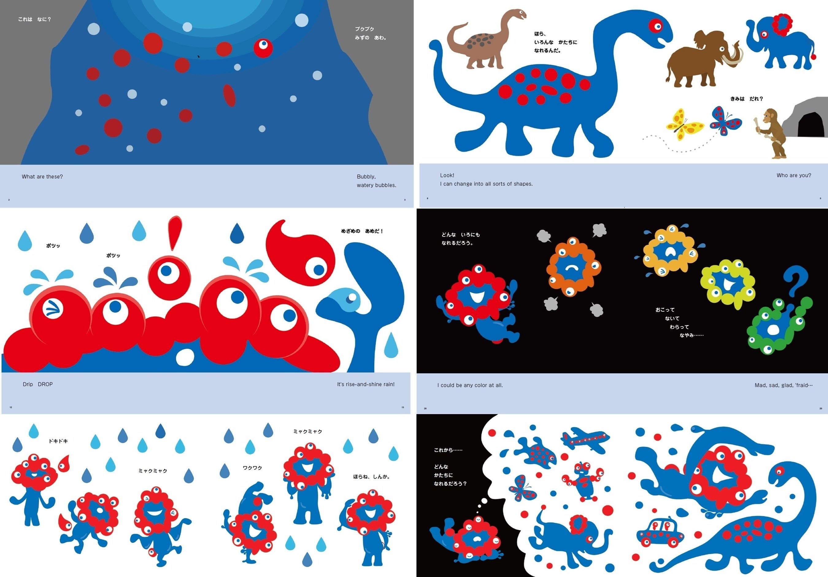 『ミャクミャクと… ミャクミャク誕生ものがたり』には、小さな細胞として誕生したミャクミャクが、ほかの生き物や自然、文明と出会うことで、世界に存在する形や色の中にある素晴らしさを見つけ、想像、変化、共生しながら未来へ脈々とつながっていく姿が描かれています。