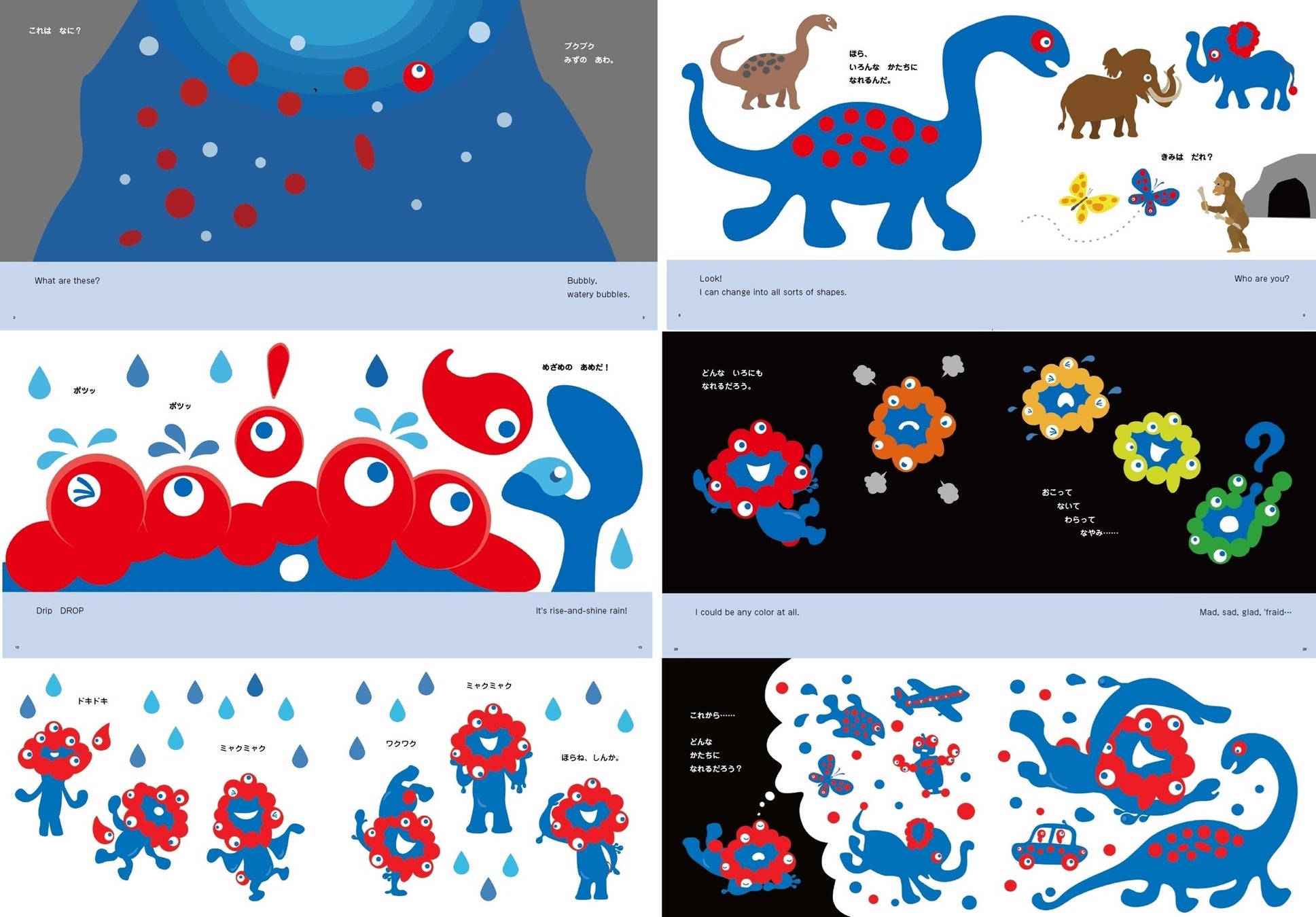 ミャクミャクの誕生から現在までの物語は、私たちに大切なことを教えてくれます。懸命に生き抜く姿は、やがて多くの人に愛される存在へと変わっていくのだということを。この絵本には、小さな細胞として誕生したミャクミャクが、ほかの生き物や自然、文明と出会うことで、世界に存在する形や色の中にある素晴らしさを見つけ、想像、変化、共生しながら未来へミャクミャクとつながっていく姿が描かれています。