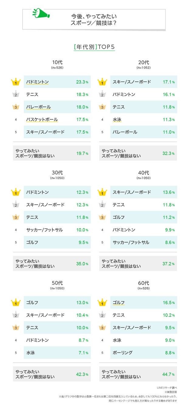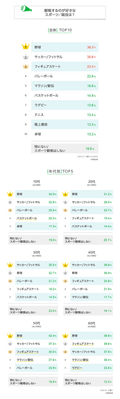 【LINEリサーチ】観戦するのが好きなスポーツは「野球」「サッカー/フットサル」が上位、今後やってみたいスポーツは「スキー/スノーボード」「バドミントン」などがランクイン