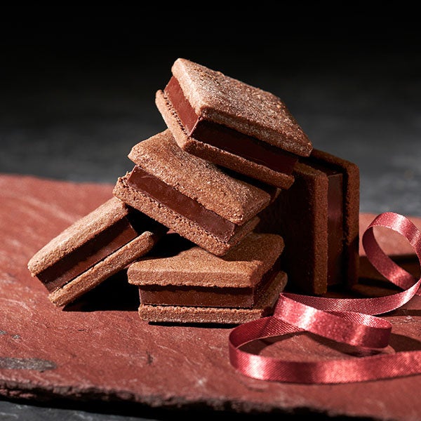 ココアサブレのサクサク食感と、しっとりとしたビターチョコレートからとろりと溶け出すほろ苦いキャラメルソースが絶妙な、キャラメルショコラサブレです。