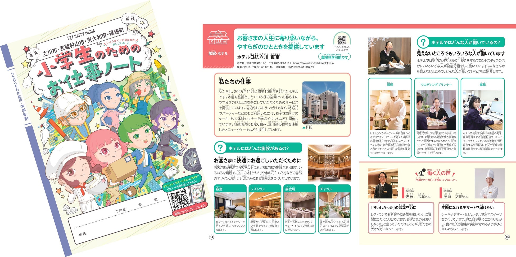 ホテル日航立川 東京(東京都立川市/総支配人 伊藤寿章)は、株式会社 中広が発行する「小学生のためのお仕事ノート 立川市・武蔵村山市・東大和市・瑞穂町」2026年度版の制作へ協賛いたしました。本誌は文部科学省が推進するキャリア教育における副読本として、小学生向けに地域企業の仕事内容が紹介されており、ホテル日航立川 東京における仕事内容や地域に向けた取り組みが、2ページにわたり分かりやすく解説されています。
