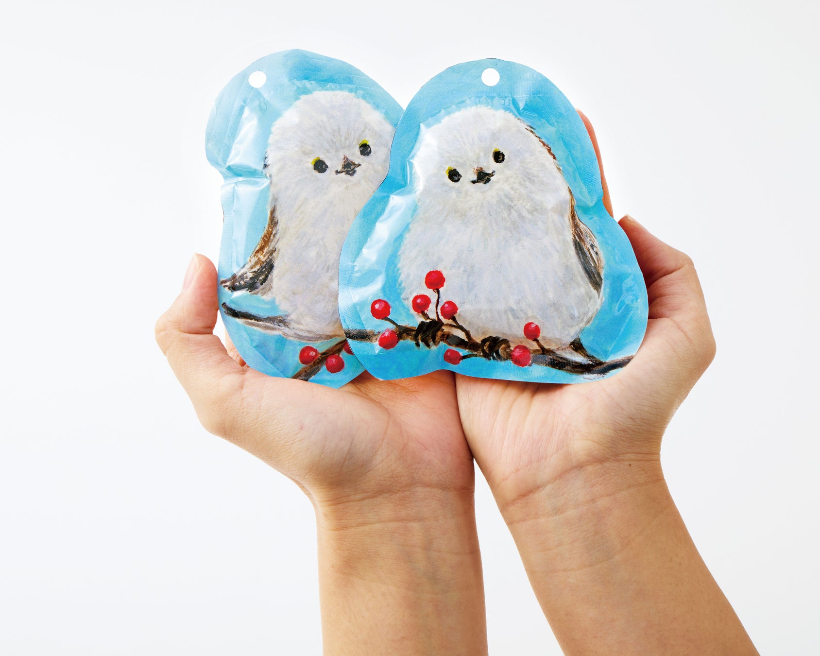 シマエナガがぎゅうぎゅうに寄り添ったかわいらしいパッケージでお届けします。友人や家族へのちょっとしたプレゼントにもぴったりです。