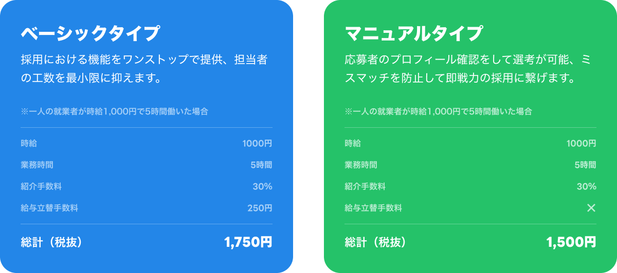 クライアントは求人出稿ごとに自由に求人タイプを選択することができ、「ベーシックタイプ」「マニュアルタイプ」2つの求人タイプの併用も可能です。職種別や期間別など、採用目的に合わせた求人プランの選択が可能になります。