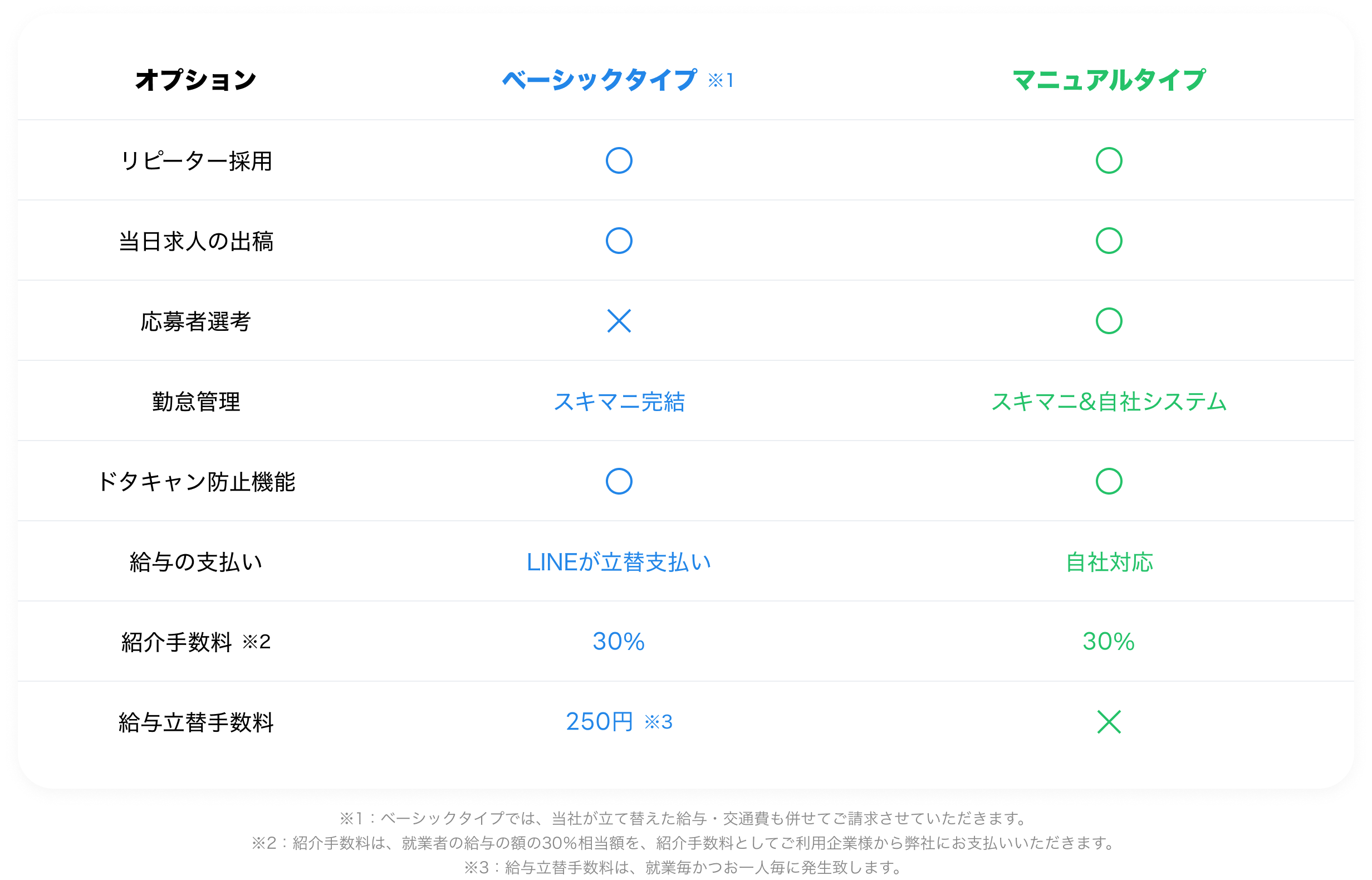 「LINEスキマニ」ではこれまで、求人・勤怠管理・給与支払いまでをワンストップで行うことで現場担当者の工数負担を最小限に抑えることができる「ベーシックタイプ」求人を提供しておりましたが、この度、新たに採用前の応募者プロフィールの確認・選考と給与の自社払いが可能な「マニュアルタイプ」求人の提供を開始いたします。
