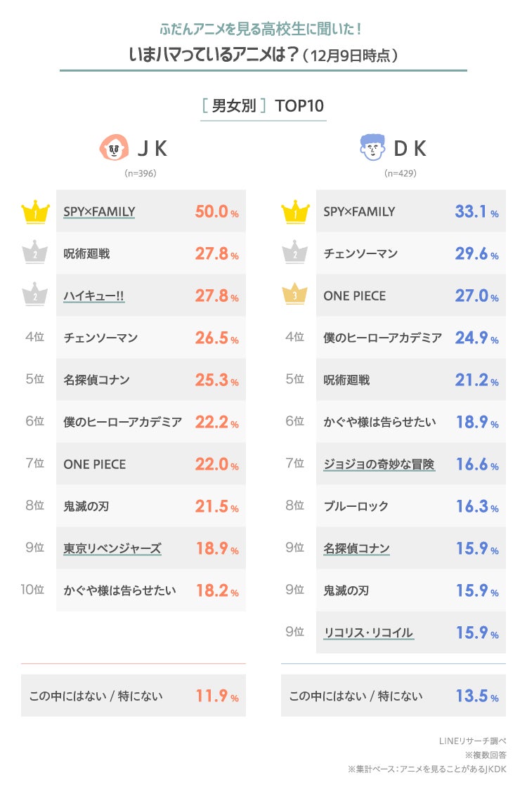 【LINEリサーチ】高校生がいまハマっているアニメは「SPY×FAMILY」が1位、アニメ化してほしい作品は「薬屋のひとりごと」「ミステリと言う勿れ」が上位にランクイン