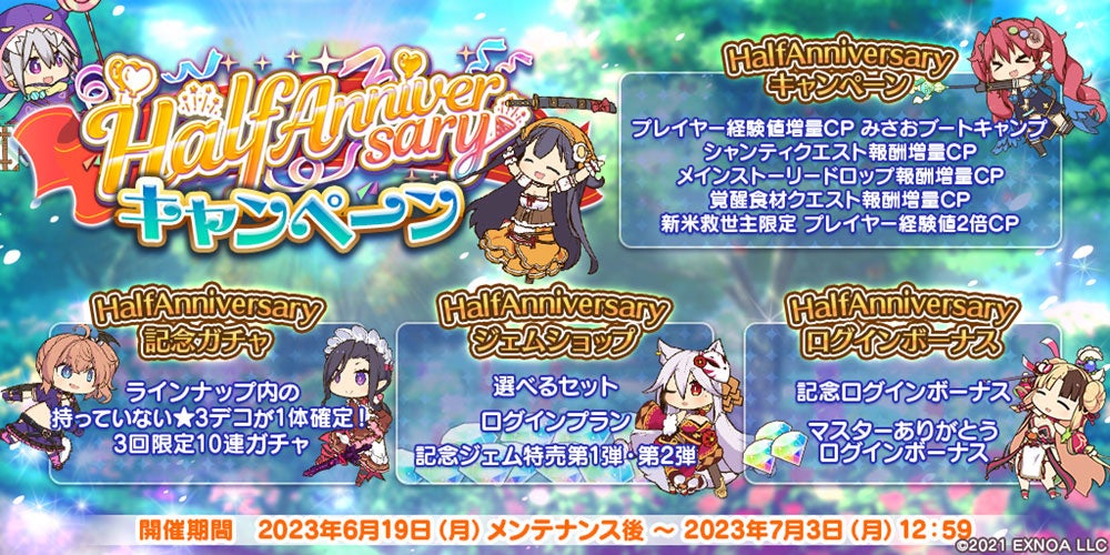 限定デコを含むラインナップから所持していない★3デコが1体確定で登場する10連ガチャ「HalfAnniversary記念ガチャ」のほか、サブクエストの報酬増量キャンペーンや期間限定クエストがまとめて開催中!