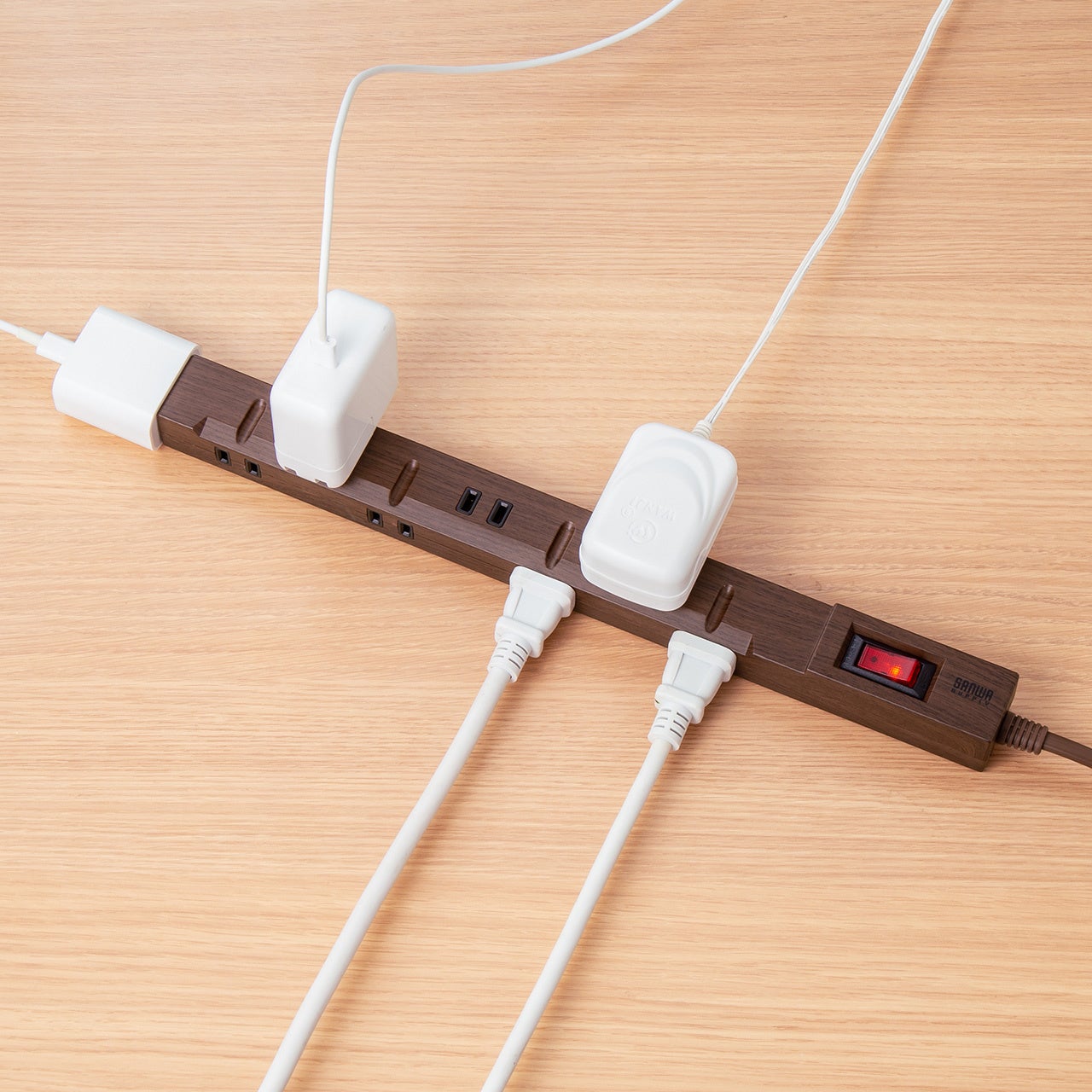本製品は、上面&側面交互差込口レイアウトでACアダプタ接続に便利なスリムタイプの電源タップです。