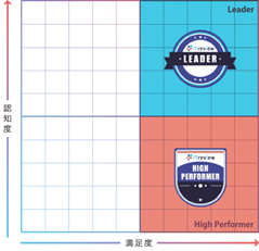 「ITreview Grid」でユーザー評価の高い2領域を表彰し、満足度・認知度両方の領域で高い評価を得たプロダクトには『Leader』バッジが発行され、満足度が高い領域のプロダクトには『High Performer』バッジが発行されます。今回の「ITreview Grid Award 2023 Fall」では、2023年9月までに掲載されたレビューの集計結果を発表しています。
