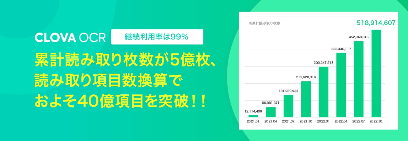 LINE株式会社(本社:東京都新宿区、代表取締役社長:出澤 剛)は、AIテクノロジーブランド「LINE CLOVA」が提供するDocument AIサービス「CLOVA OCR」が、2021年1月の販売開始から2022年10月末までの累計読み取り枚数5億枚、項目数換算にしておよそ40億項目を突破しましたので、お知らせいたします。※1, ※2, ※3