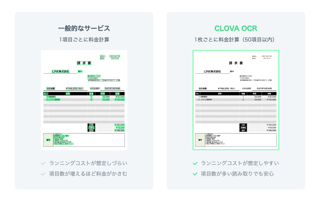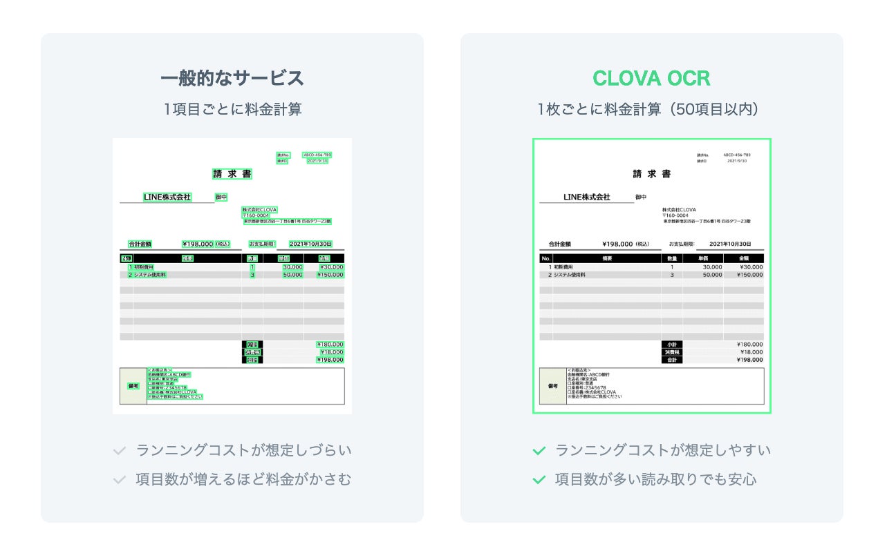 一枚の画像中、記載項目毎に課金するサービスが多い中、「CLOVA OCR」は枚数ごとに課金を行うため、ランニングコストの計算がしやすく、価格も安価な設定となっている点が特長です。