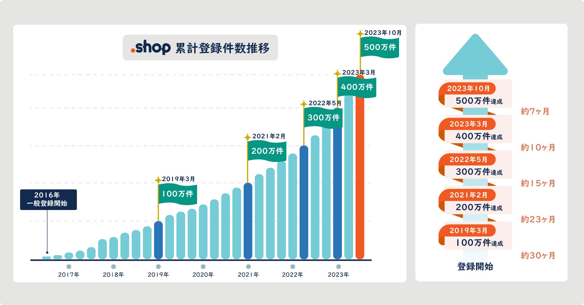 その後、2016年9月27日の一般登録開始から年々登録数を伸ばし、2020年の新型コロナウイルス感染症拡大の際には、ECサイト構築サービスの急速な普及と相まって、北米や欧州を中心に登録数が急増しました。コロナ禍が沈静後も登録の勢いは衰えず、2023年3月に400万件を突破し、そこからわずか7ヶ月で500万件に達しました。
