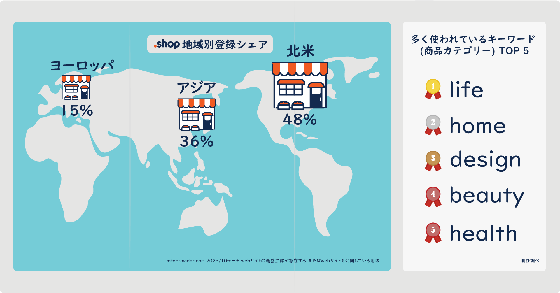地域別の登録シェアを見ると、北米が48%と半数近くを占めており、特に新型コロナウイルスの感染拡大以降、登録が急増しました。アジアでは中国や日本、ヨーロッパではドイツ、オランダをはじめとした多くの国で「.shop」が利用されています。