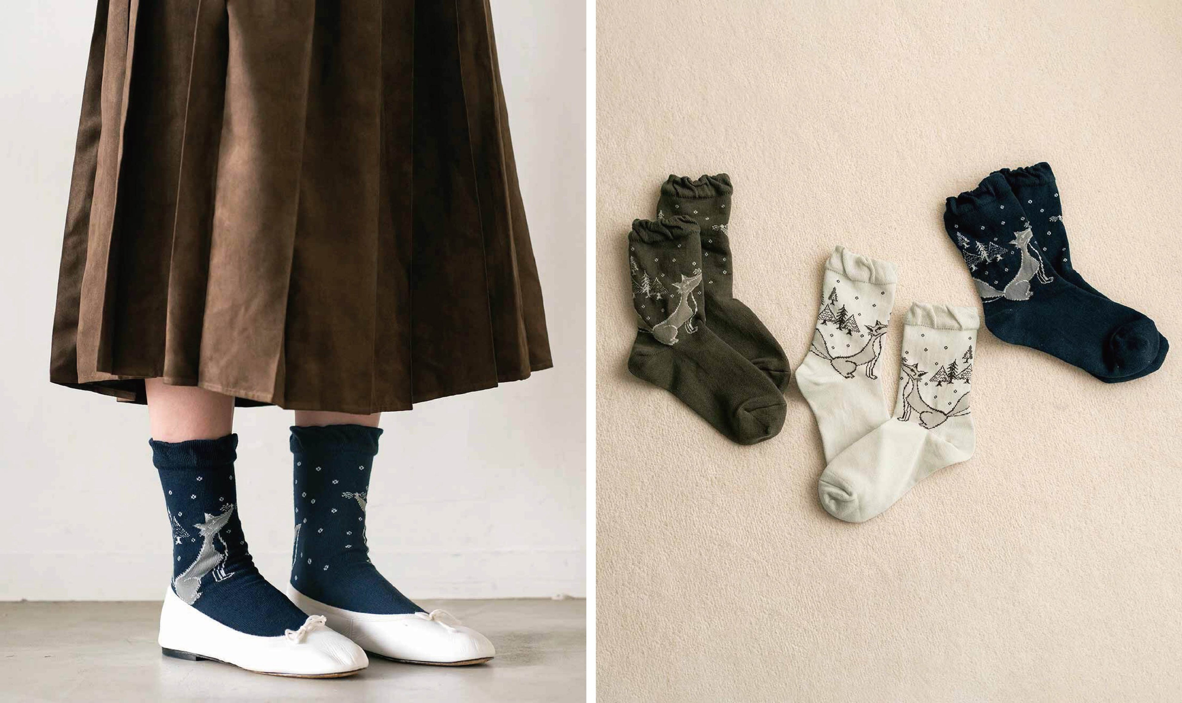 山本祐布子さんが描く、凛とたたずむキタキツネ。まるで絵本の1ページのように美しい世界観を、360°どの視点からも楽しめるように編み立てました。肌心地のよいコットンの糸を使い、つま先は肌側シルク混の二重編み仕様であたたかくむれにくい上質な靴下。冬のおしゃれはもちろん、お家で過ごすやさしい時間の相棒にも◎。