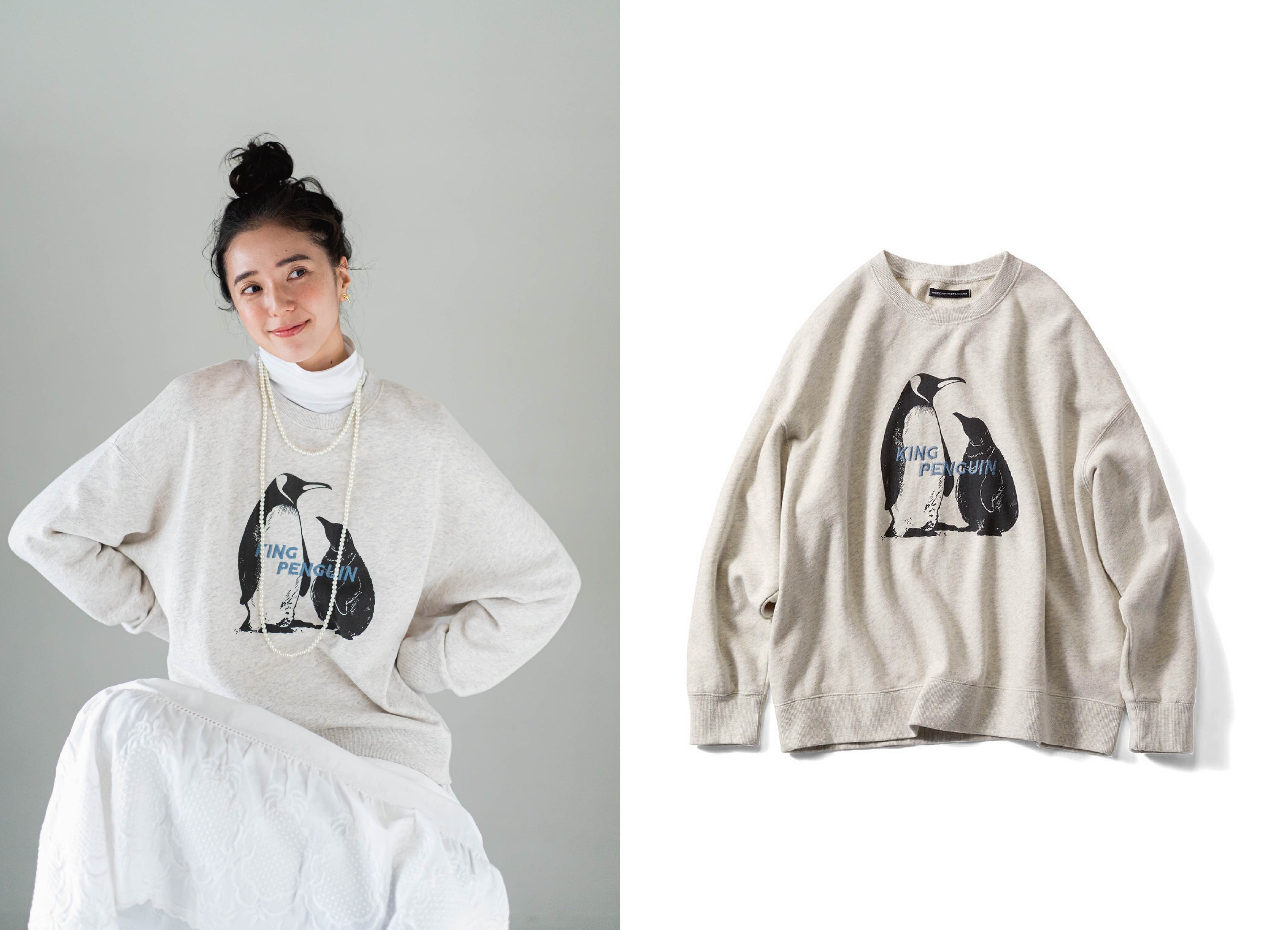 旭山動物園の冬の風物詩「ペンギンの散歩」でおなじみのキングペンギン。“自然のたくましさと愛らしさ”を体現する存在として、モチーフに選びました。リアルタッチのモノクロプリントの上に刺しゅう文字を重ね、表情に奥行きをプラス。少し大きめのメンズライクなシルエットに、衿・すそ・袖口のリブをきかせて、子どもっぽさをおさえた大人カジュアルな一枚です。合わせやすい落ち着いたカラーで、デイリーに活躍します。