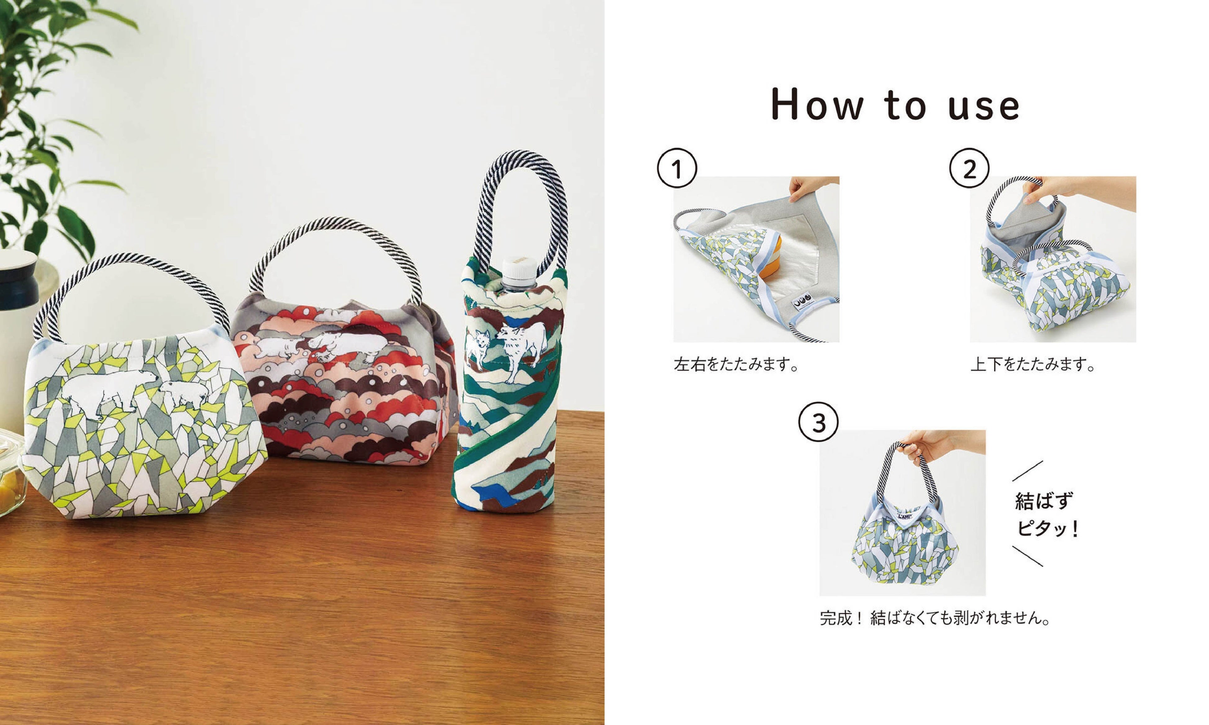 繊維同士がくっついて、巻くだけでお弁当が包める特殊なクロス。運びやすい持ち手付きで内側は保温・保冷効果のあるアルミ仕様。どんな形のものも包めるので、箱ものやボトルのラッピングにもおすすめです。旭山動物園で暮らす動物の親子と自然の風景をポップに描いたクロスは、柄違いで集めたくなるかわいさ! ランチクロスとしても使えるから、家族みんなのお弁当にどうぞ。