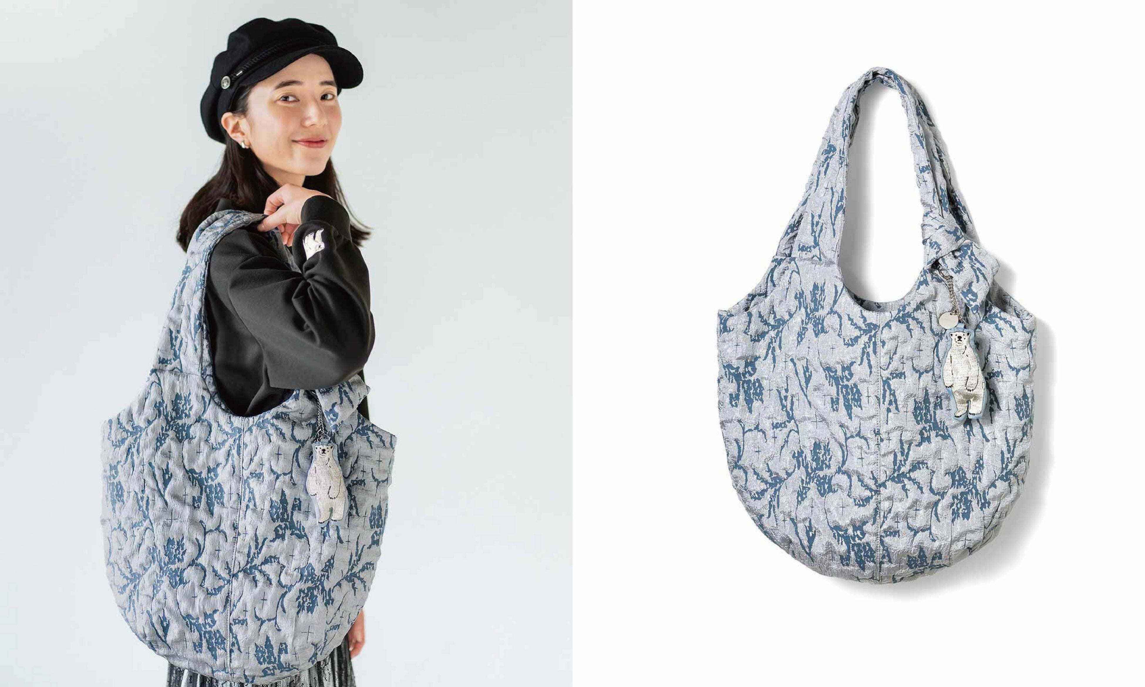 流氷が浮かんできらめく氷海みたいな表情のある生地を使い、青くて丸い地球をイメージして作ったラウンド型のシンプルなバッグです。たっぷり入って整理しやすい3部屋構造でポケットも充実。本体部分も持ち手もふっくらしていて、肩かけOK。取り外し可能なマスコット仕立てのチャームは、ちょっぴり人間味のある立ち姿のホッキョクグマ。