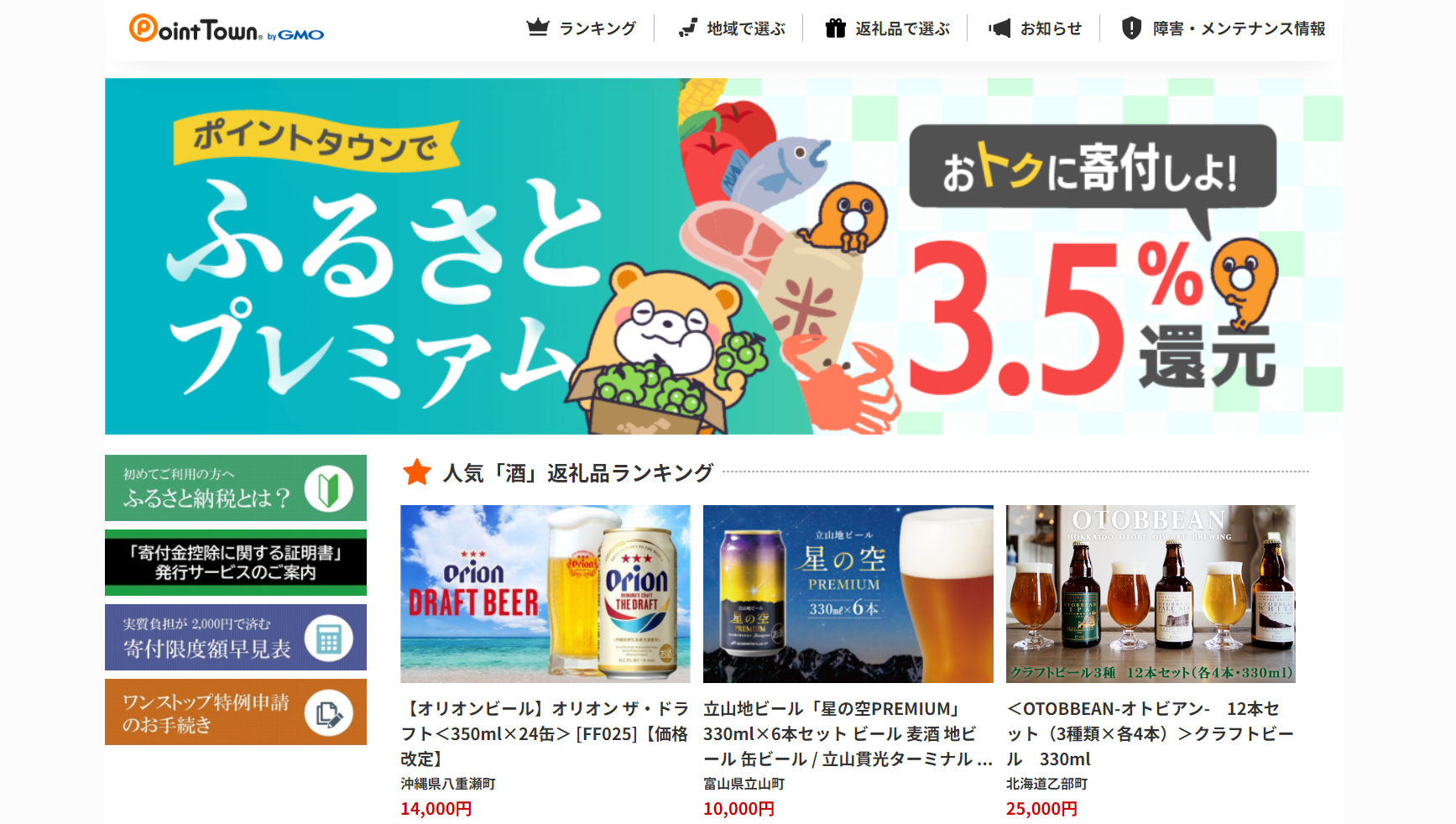 「ポイントタウン byGMO」の「ふるさとプレミアム」ページ