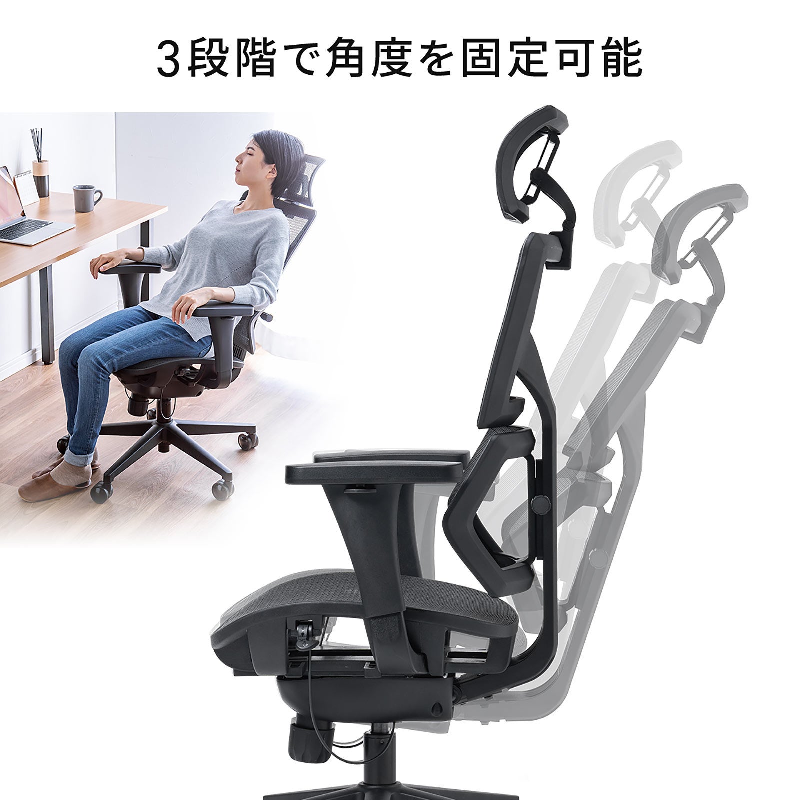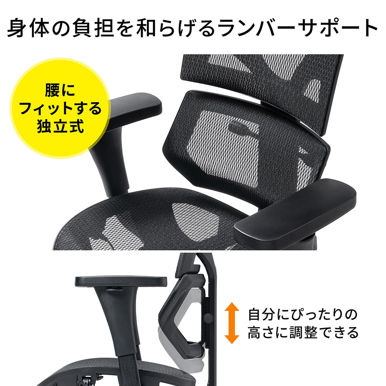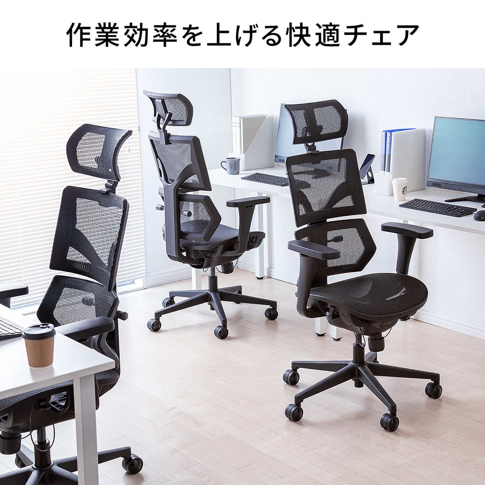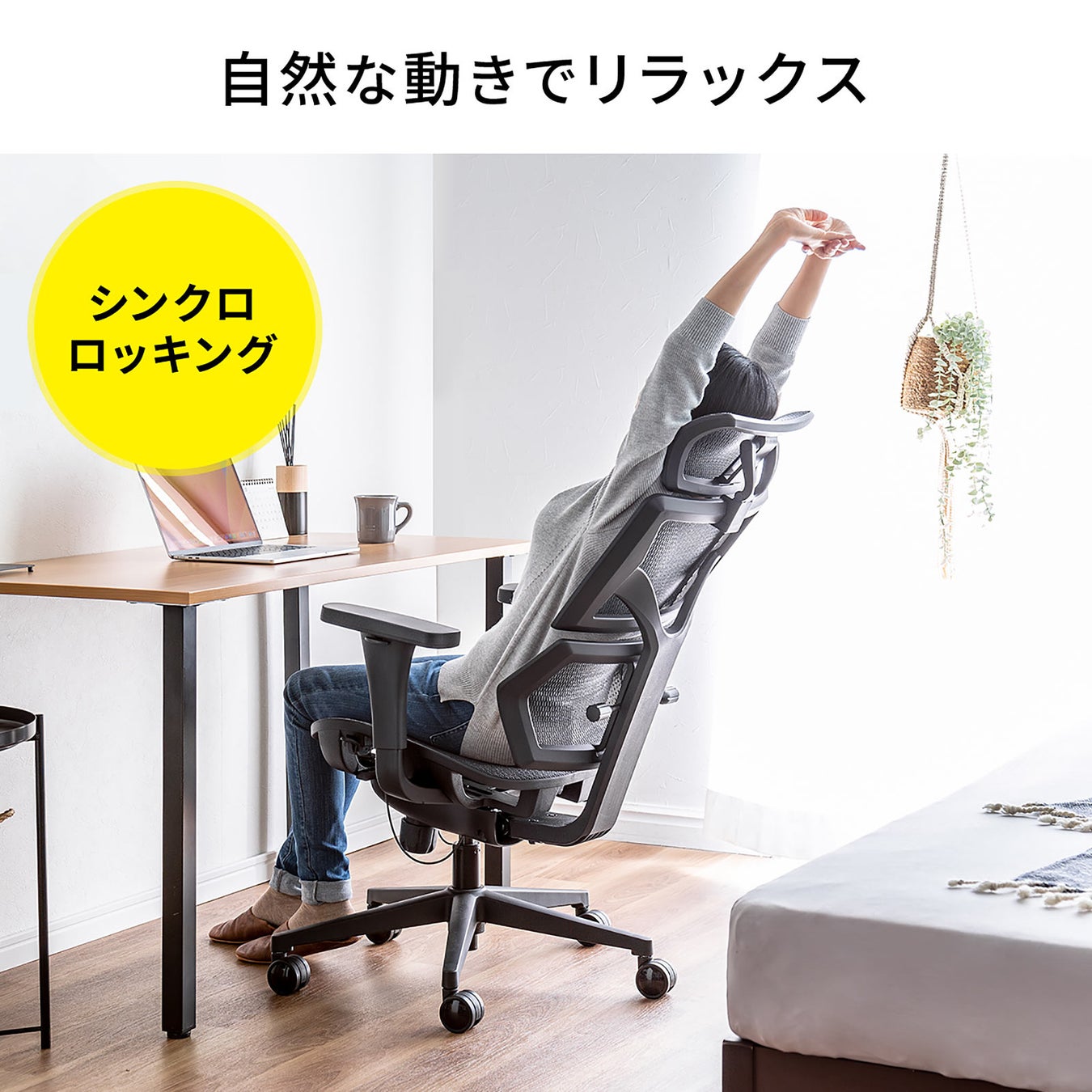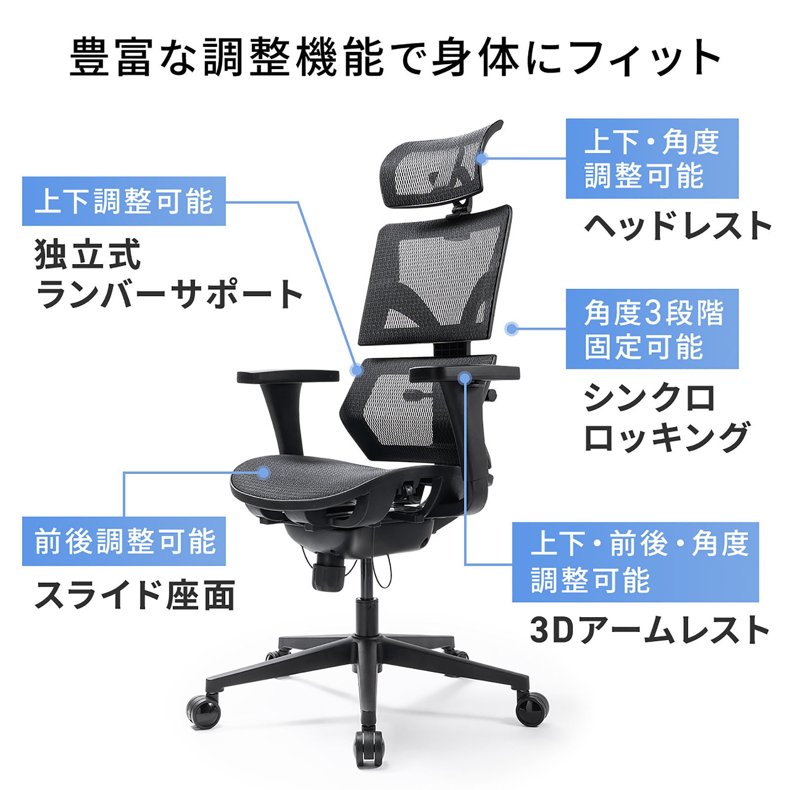 メッシュチェア スリム形状背もたれ シンクロロッキング 3段階ロッキング固定 ランバーサポート 座面調整 3Dアームレスト ヘッドレスト