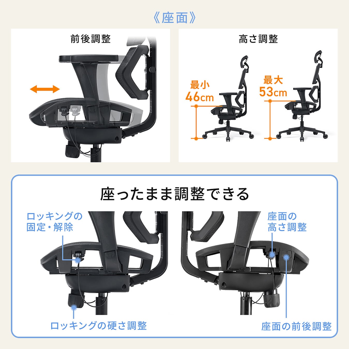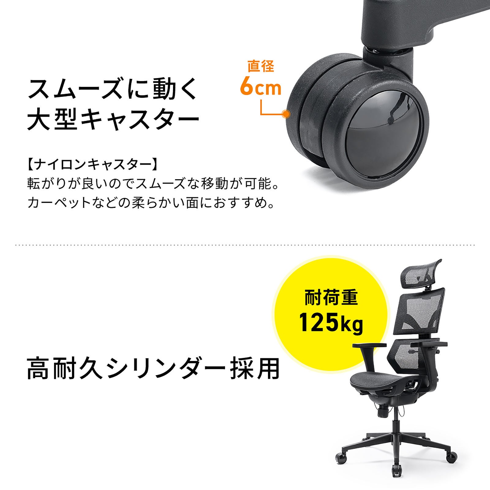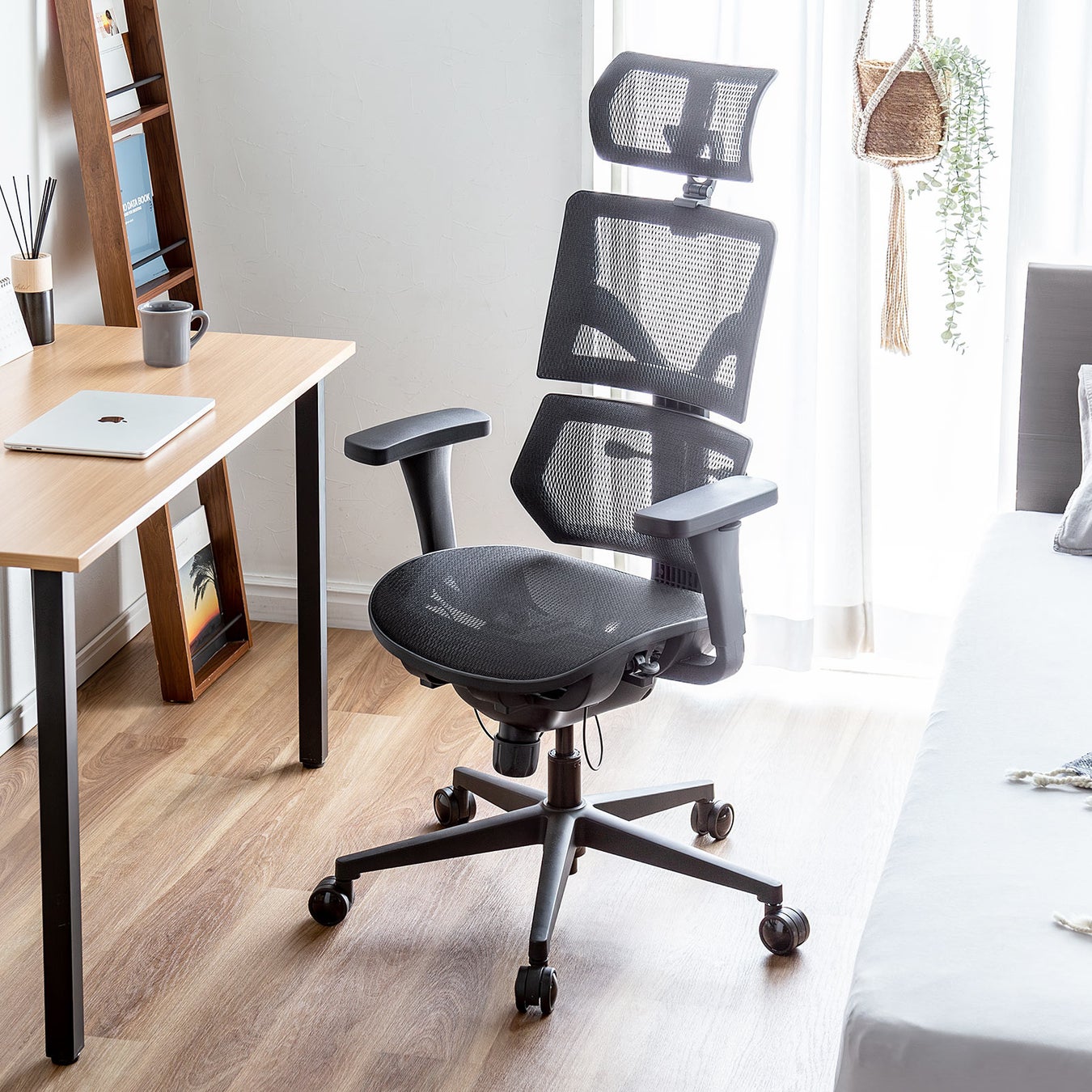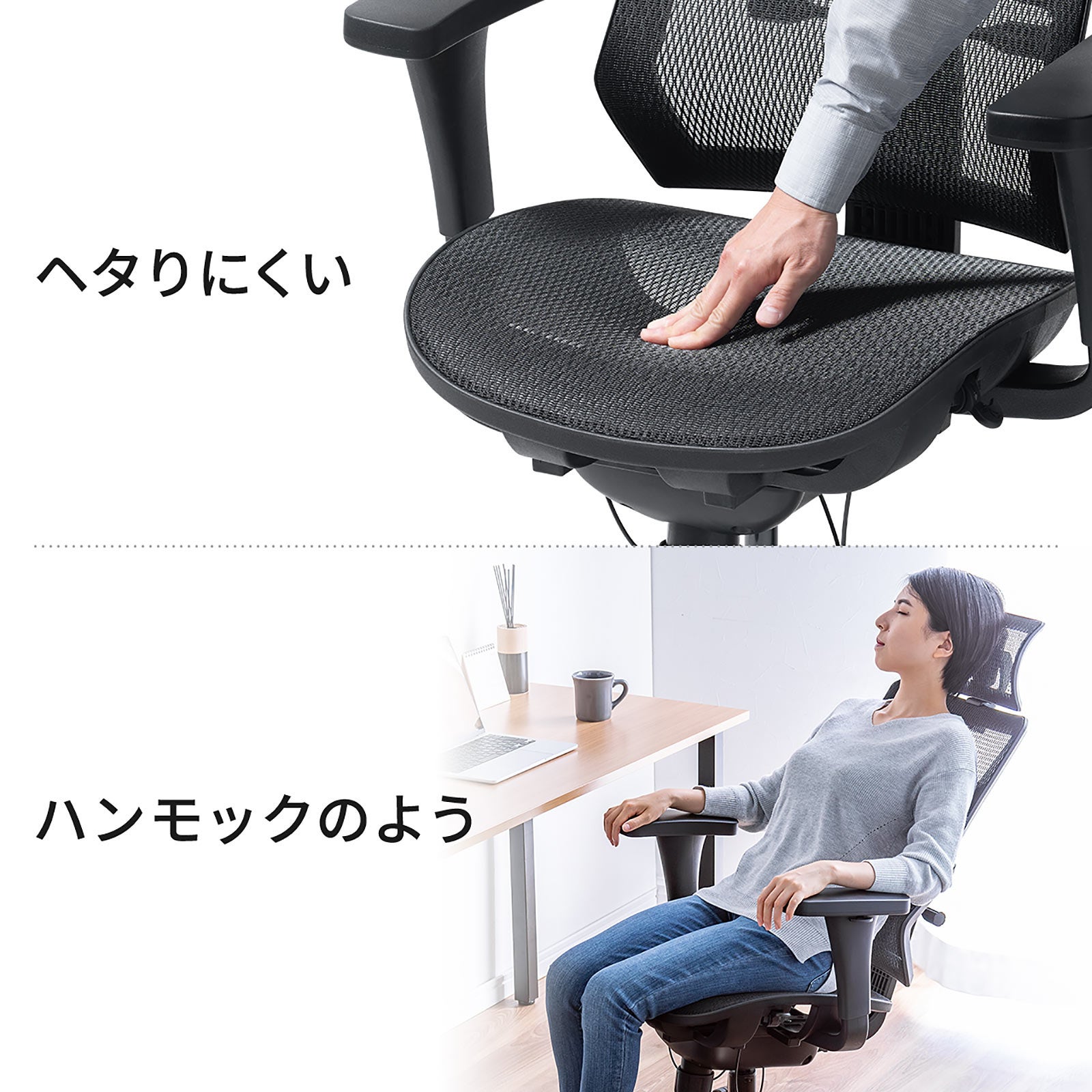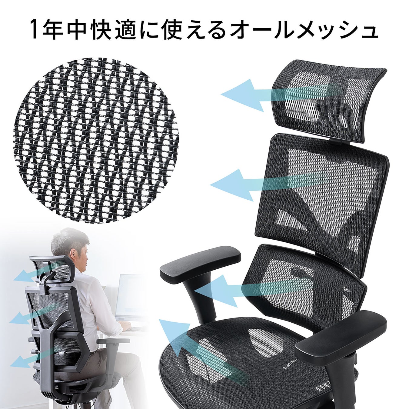 メッシュチェア スリム形状背もたれ シンクロロッキング 3段階ロッキング固定 ランバーサポート 座面調整 3Dアームレスト ヘッドレスト