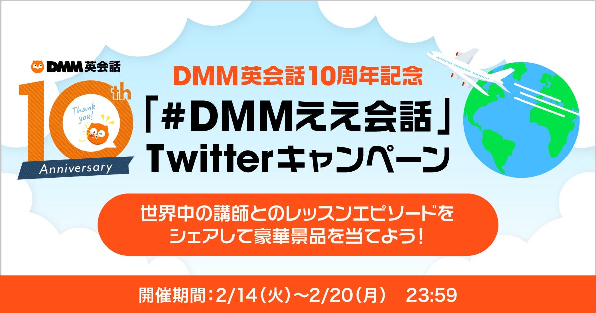 合同会社DMM.com(本社:東京都港区、会長 兼 CEO 亀山敬司、https://dmm-corp.com/ 以下DMM )で展開中の「DMM英会話」( https://eikaiwa.dmm.com/ )は、本日、2023年2月14日(火)にサービス開始10周年を迎えました。これを記念し、ユーザーの皆さまに感謝の気持ちを込めて、2月14日(火)〜 2月20日(月)の期間、世界中の講師とのレッスンエピソードを募集する「#DMMええ会話」Twitterキャンペーンを開催します。