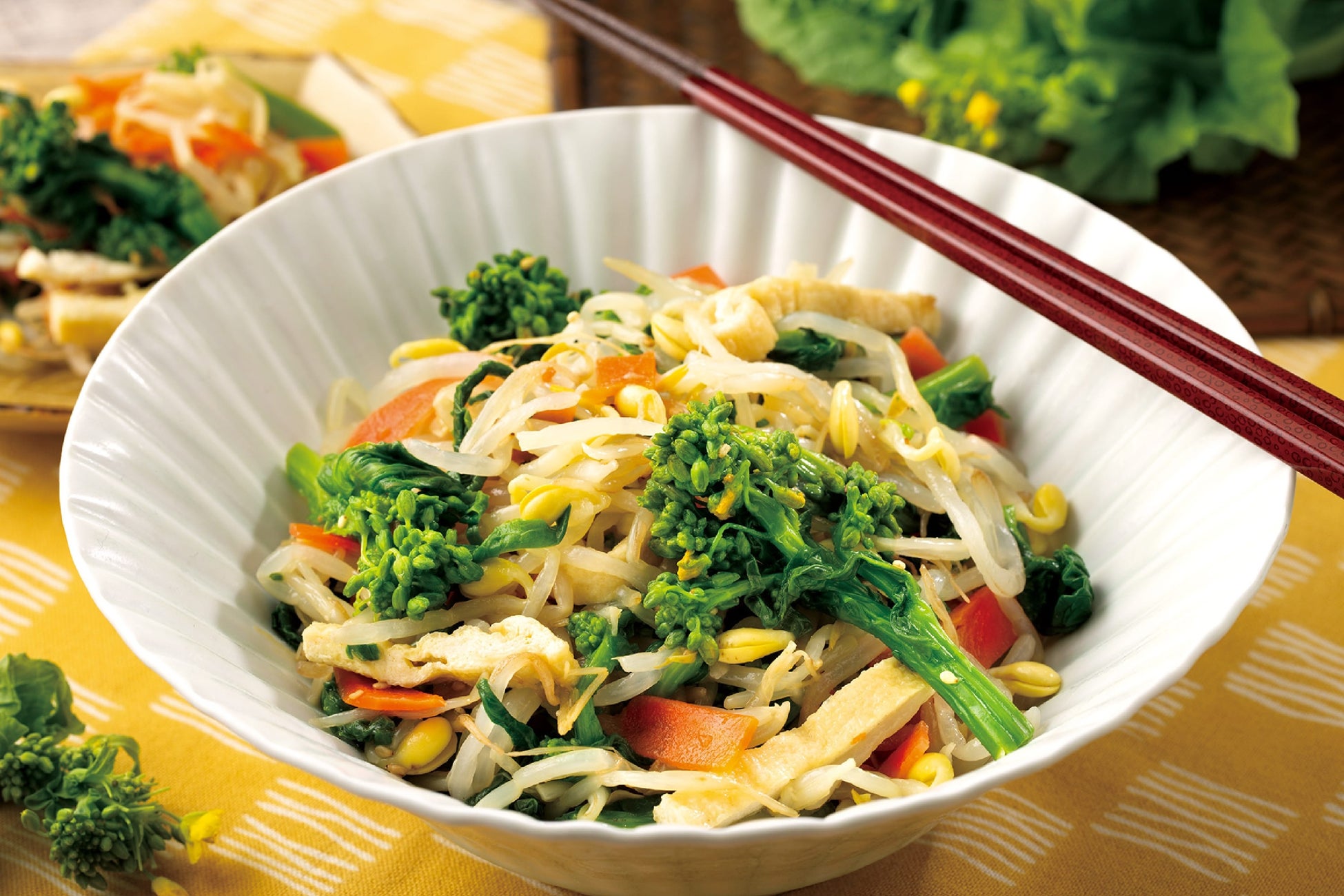 寒暖差の大きい南房総で育った菜の花は、ほろ苦さの中に甘みが感じられることが特徴です。また、もやし、豆もやし、人参、油揚げと組み合わせた辛子和えは、菜の花の食感とほろ苦さを活かしながらも辛子和えの辛味がしっかりと感じられる一品となっています。