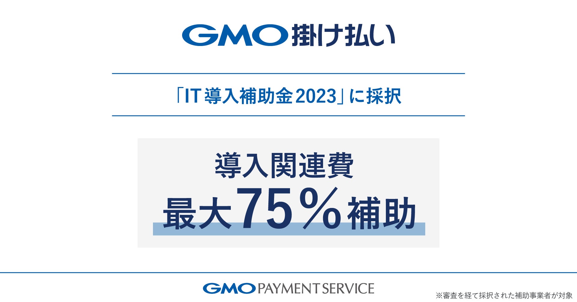 このたびGMO-PSは、「IT導入補助金2023」のIT導入支援事業者として採択され、「GMO掛け払い」が企業間取引のデジタル化を推進することを目的とする対象ツールとなりました。これにより補助事業者は、導入関連費(最大2年分)を最大75%まで補助を受けて、「GMO掛け払い」を導入することが可能となります。