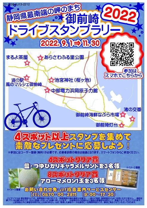 一般社団法人日本自動車連盟(JAF)静岡支部(支部長 太田勝之)は、9月1日(木)から、御前崎市観光協会(会長 川口正洋)が主催する「静岡県 最南端の岬のまち 御前崎ドライブスタンプラリー2022」の開催に協力します。