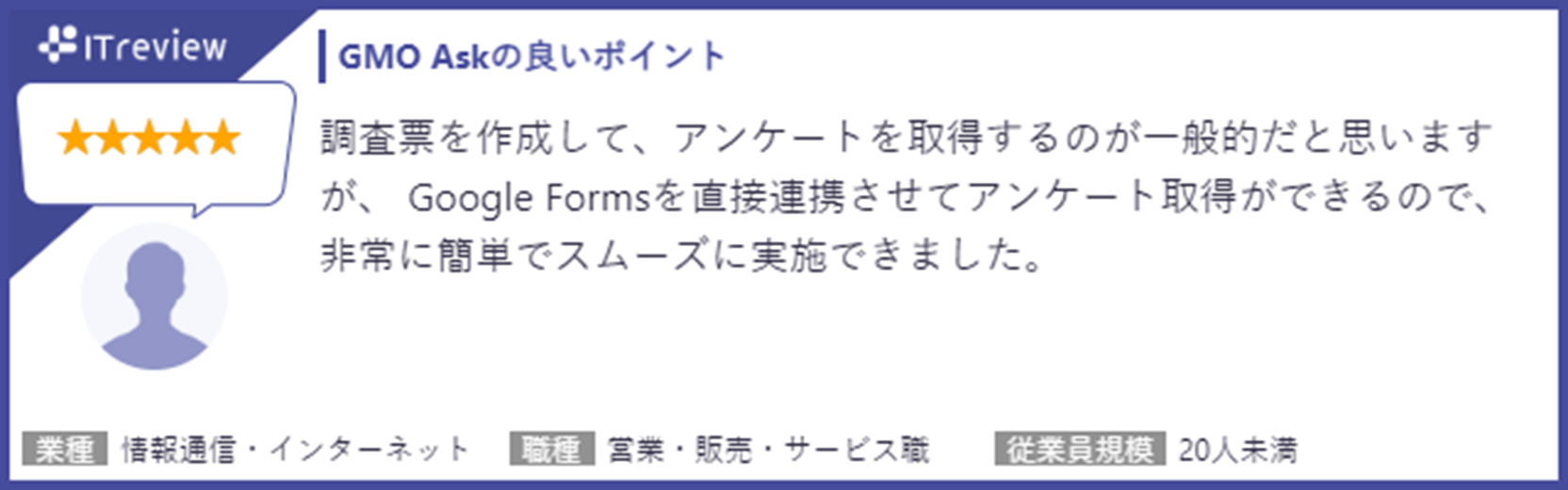 「GMO Ask」をご利用いただいている方からのレビューでは、 “ユーザーの多い「Google Forms®」との連携“、”直観的に操作できるUI/UX“、”設定可能な属性条件の豊富さ “、”スピーディーさ”などを支持する声をいただいています。
