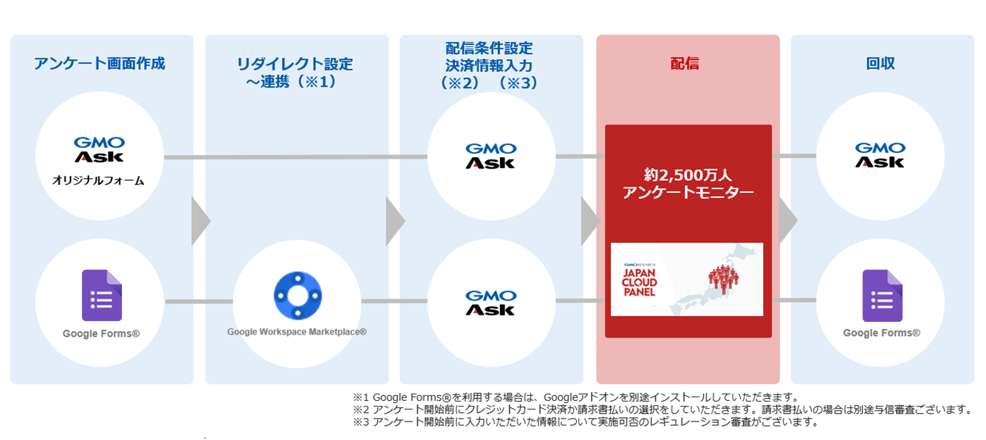 「GMO Ask」のウェブサイト(URL: https://gmoask.jp)から新規会員登録し、アンケート画面作成を2つのパターンから選択できます。①「GMO Ask」上のオリジナルフォームを利用してアンケート画面を作成、もしくは②「Google Forms®」でアンケート画面を作成した後、調査対象者の希望条件などを入力することにより、「JAPAN Cloud Panel」で抽出したモニターに向けてアンケートを配信することができます。