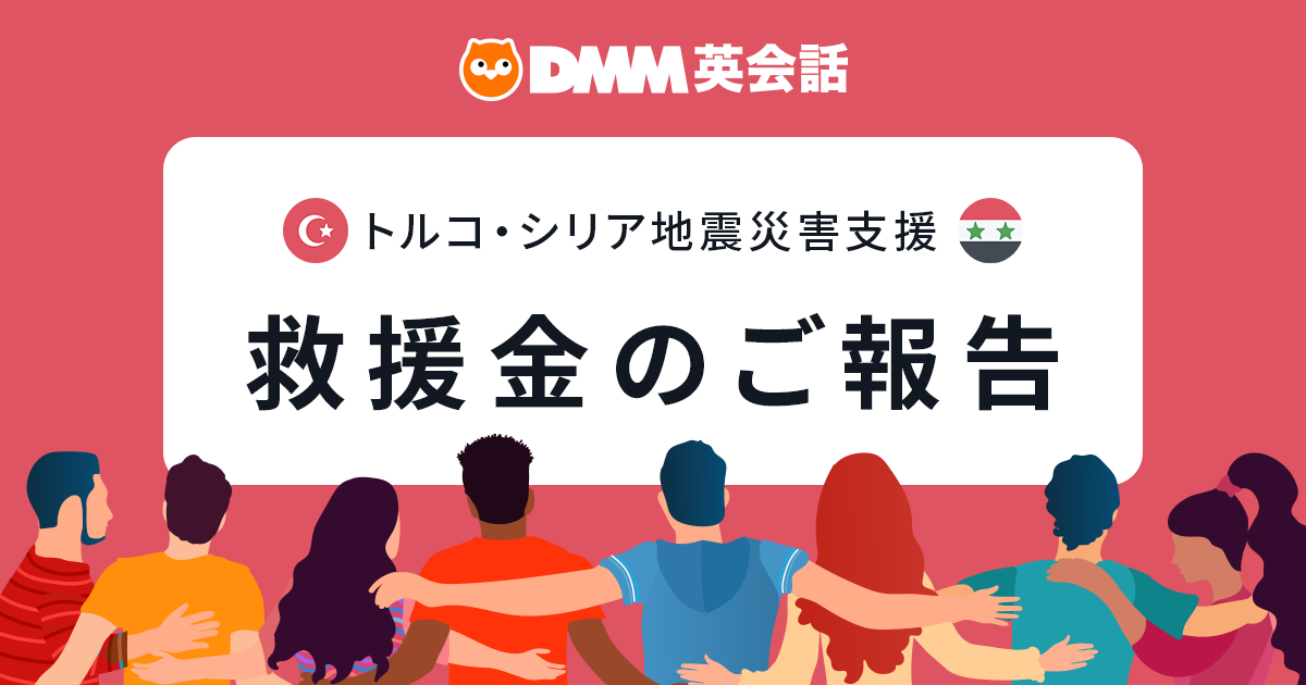この度のDMM英会話の取り組みに賛同し、ご支援・ご協力をいただきました皆さまに改めて感謝を申し上げるとともに、1日でも早くトルコ・シリアで被害に遭われた方々に平穏な日々が訪れますよう、心よりお祈り申し上げます。