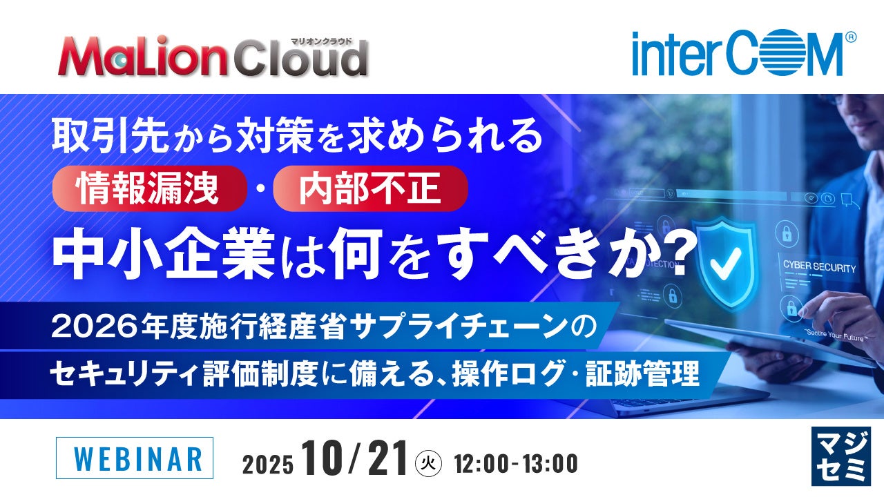 本セミナーでは、サプライチェーン評価制度に備える中小企業向けに、操作ログの取得から証跡提示までを一元的に支援する「MaLionCloud」を活用した具体的な対策を解説します。クラウド型で導入・運用の負担を最小限に抑えつつ、必要な証跡を自動的に蓄積できる仕組みにより、限られたリソースでも評価制度が求める水準に確実に準拠する方法を提示します。さらに、取引先からの監査や契約更新の際に即座に証跡を提示できることで、契約維持と信頼確保を実現し、安心してビジネスを継続できる体制を整えられます。