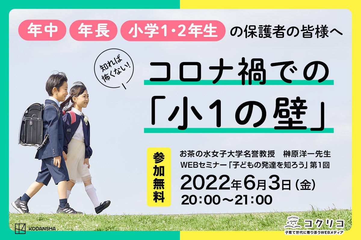 株式会社講談社の子育て情報メディア「コクリコ」は、2022年6月3日(金)にオンラインライブセミナーを開催します。子どもの発達研究の第一人者である、お茶の水女子大学名誉教授・榊原洋一先生を講師に招き、「小1の壁」に悩むパパママの心配や疑問に応えます。