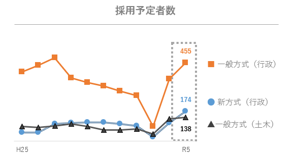Ⅰ類B(一般方式)「行政」は、昨年度から95人増の455人、「土木」は、昨年度から8人増の138人となり、ともに、近年で最大規模の採用予定者数となっています。