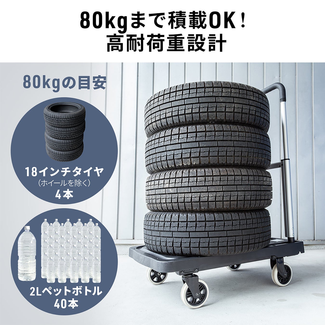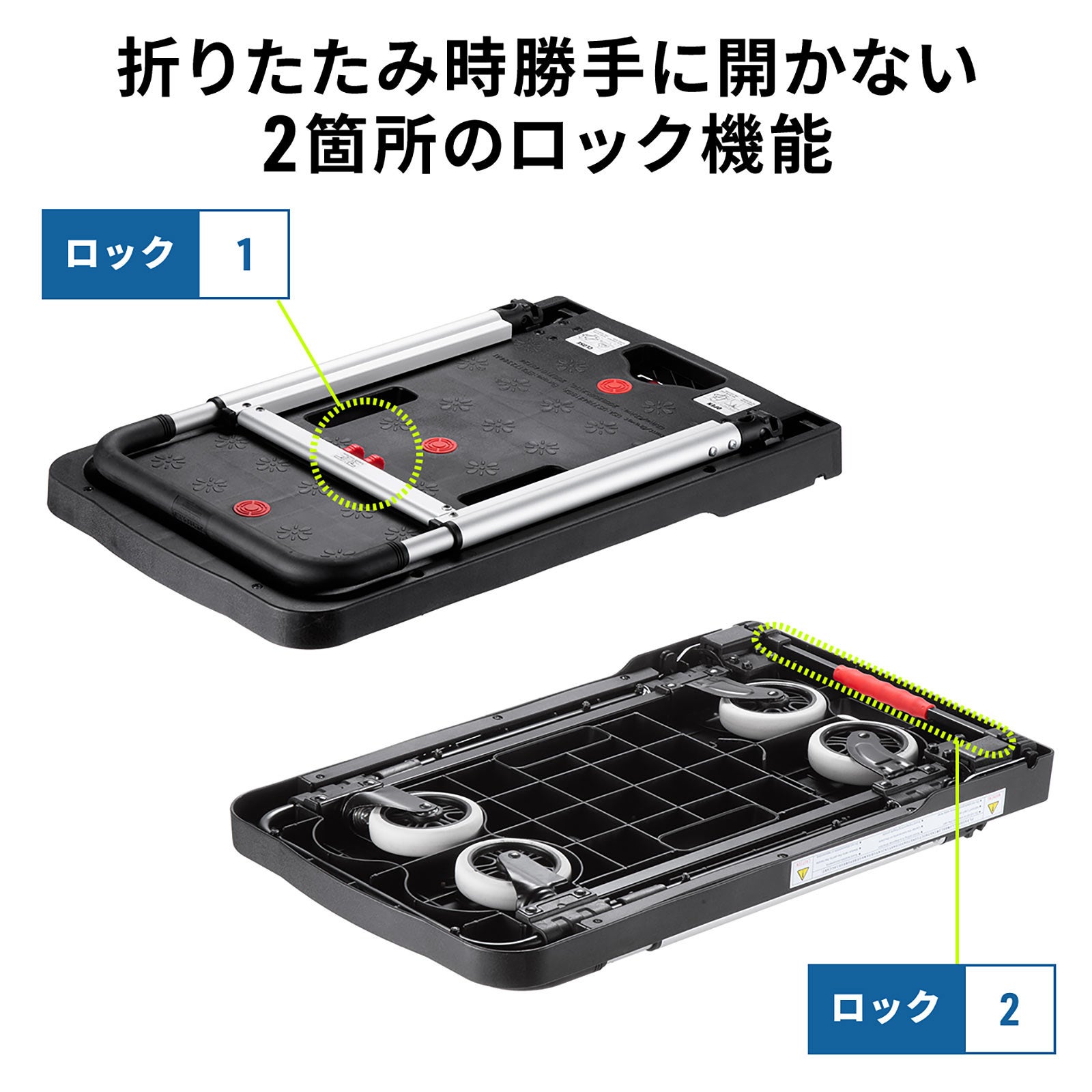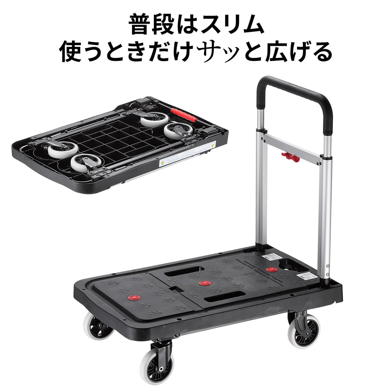 本製品は、キャスターとハンドルを折りたたんでフラットにできる台車です。折りたたむと厚さ約8cmになり、省スペースに収納できます。