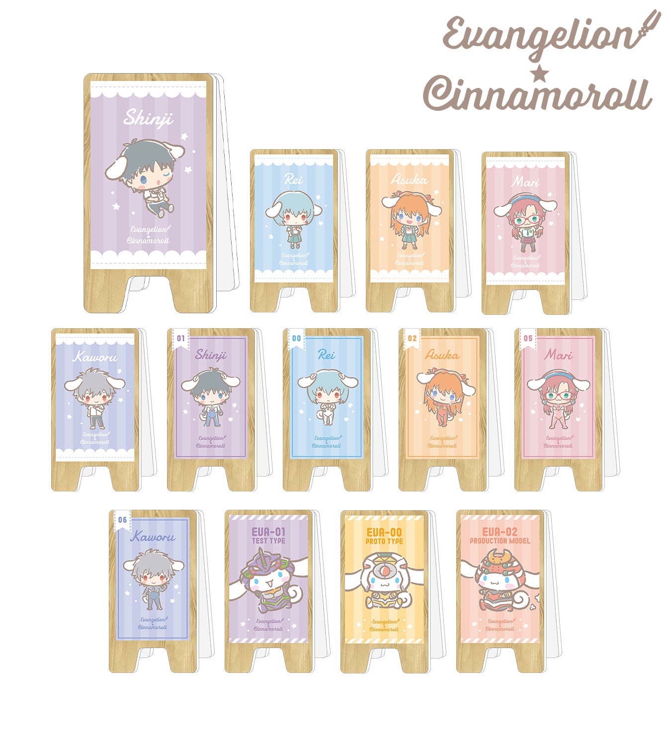 碇シンジ、綾波レイ、式波・アスカ・ラングレー、真希波・マリ・イラストリアス、渚カヲル、シナモロールのイラストと作品のイメージカラーを組み合わせてデザインしました。