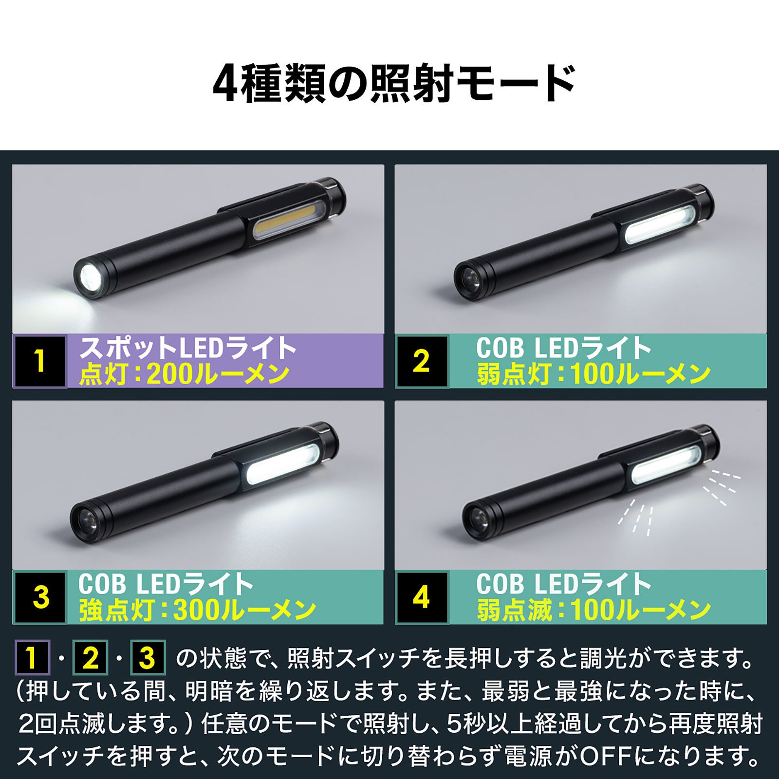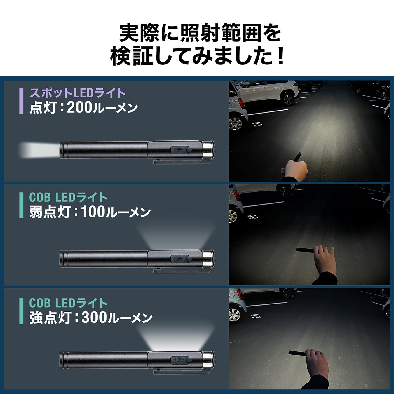 ペン型LEDライト USB充電式 LED懐中電灯 マグネット内蔵クリップ 防水規格IP54 最大300ルーメン