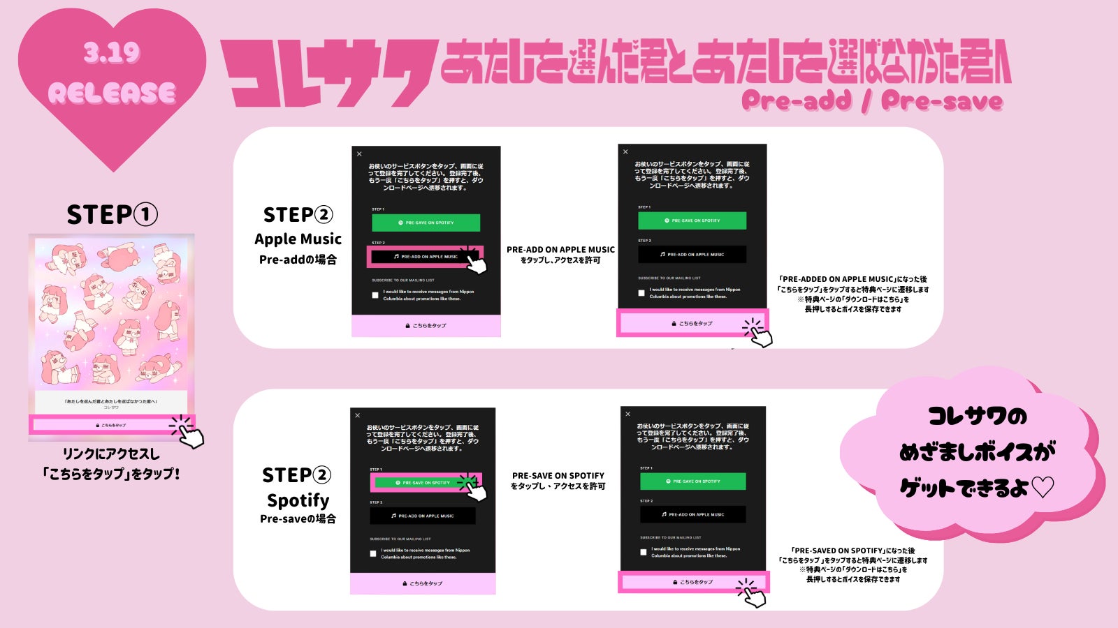 指定の期間内に指定のURLよりApple Music / SpotifyにてPre-add / Pre-saveしてくれた方全員に「コレサワめざましボイス」をプレゼント!