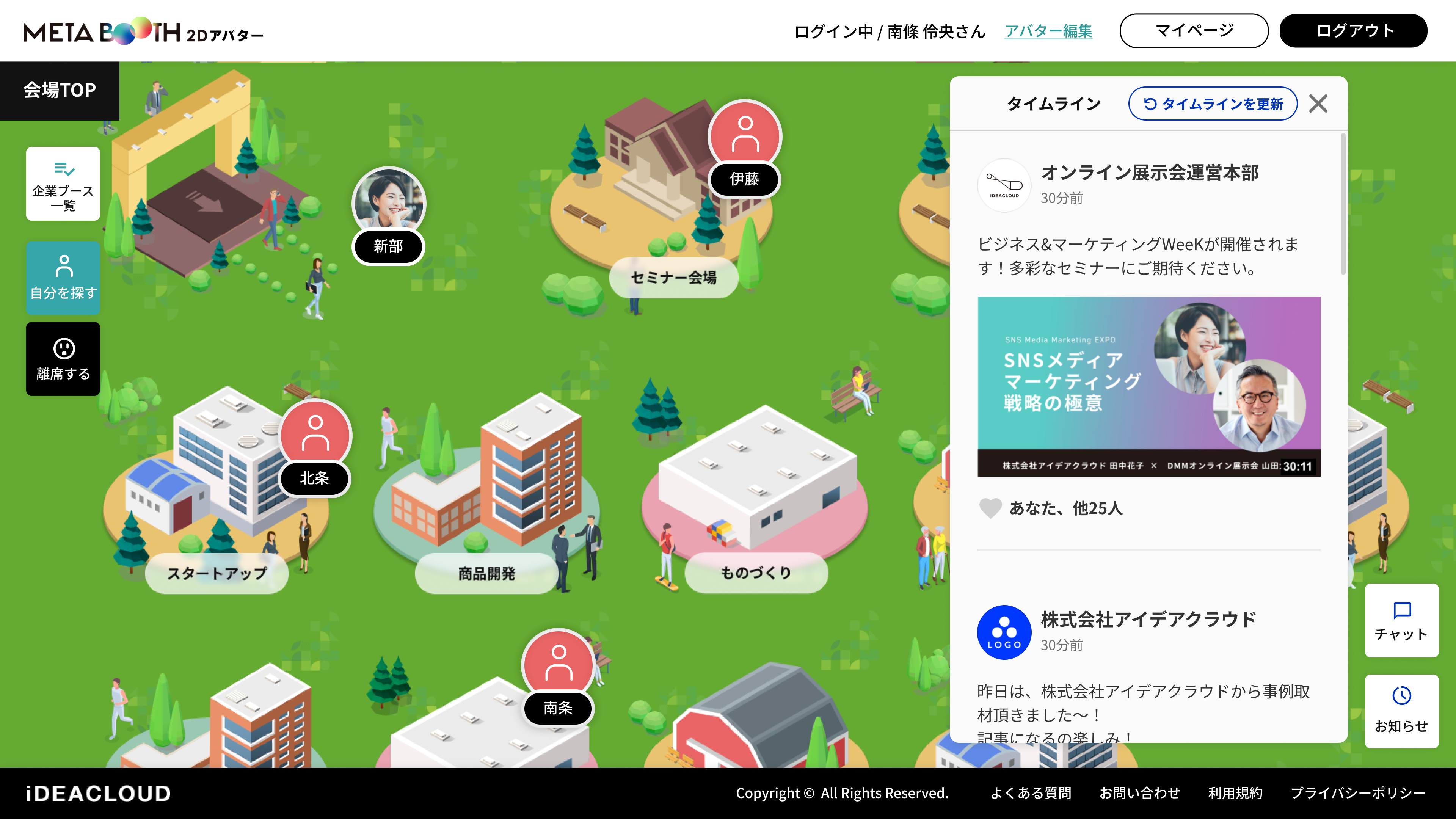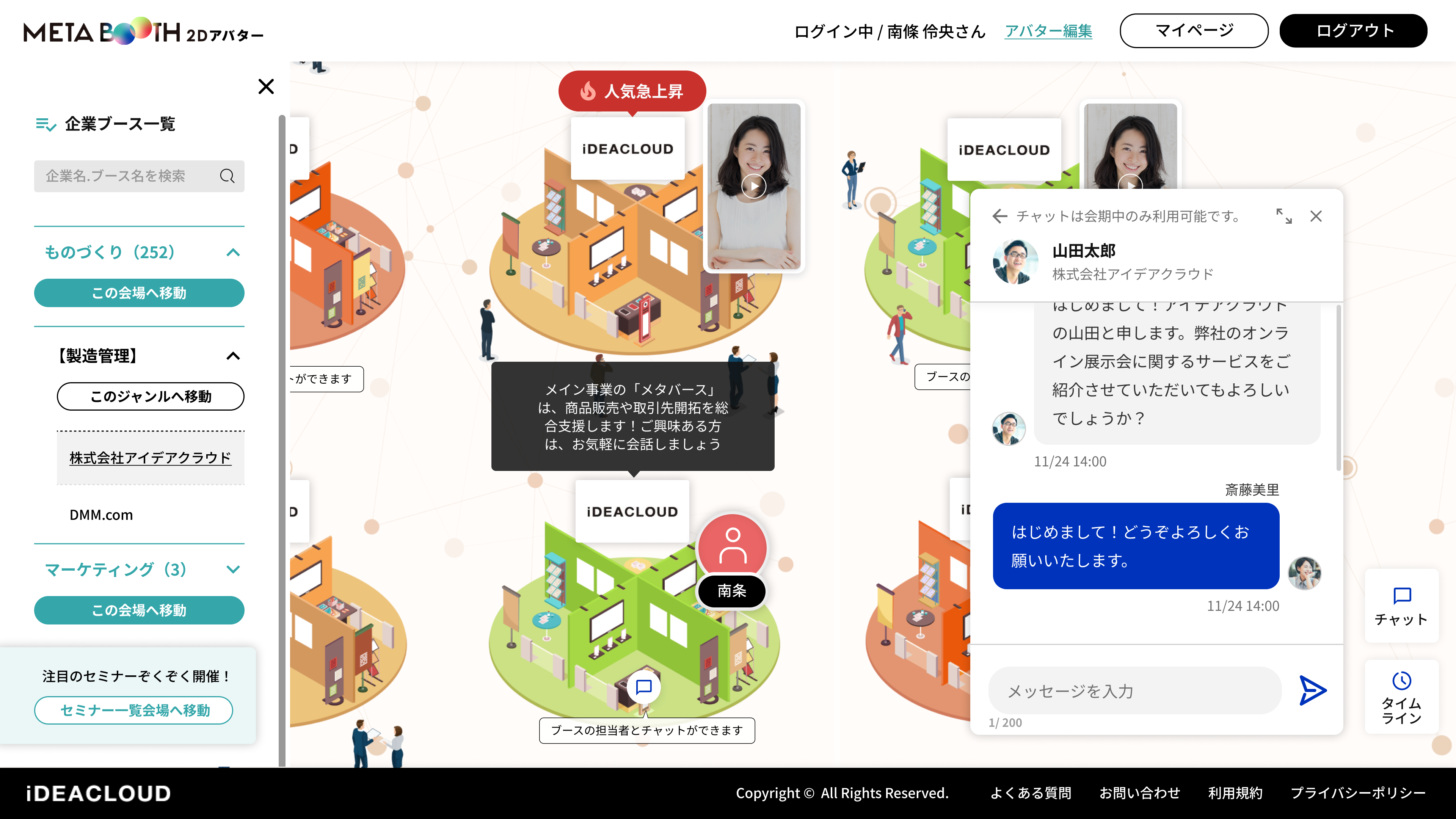 2Dアバターを使って会場を自由に巡り、展示ブースの閲覧はもちろん、チャットやビデオ通話など様々なコミュニケーションを行うことが可能で、ビジネス利用からエンタメ系イベントまで幅広くご活用いただけます。誰でも直感的に操作でき、 リアルに近いライブ感のある展示会やイベントの実施が可能です。