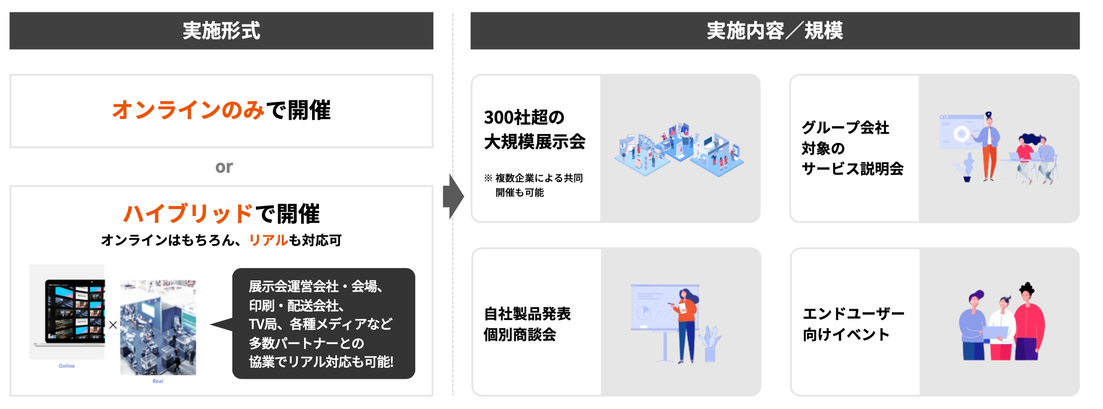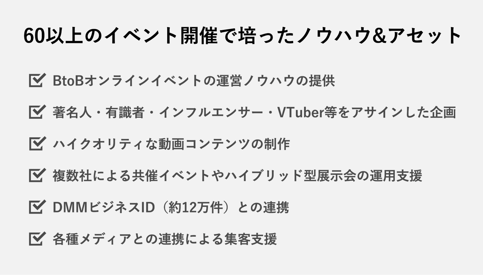 BtoBオンラインイベント運営ノウハウの提供や著名人・有識者・インフルエンサー・VTuber等を起用した企画や動画コンテンツの制作、複数社による共催イベントやハイブリッド型展示会の運用支援の他、DMMビジネスID(約12万件)や各種メディアとの連携による集客支援が可能です。