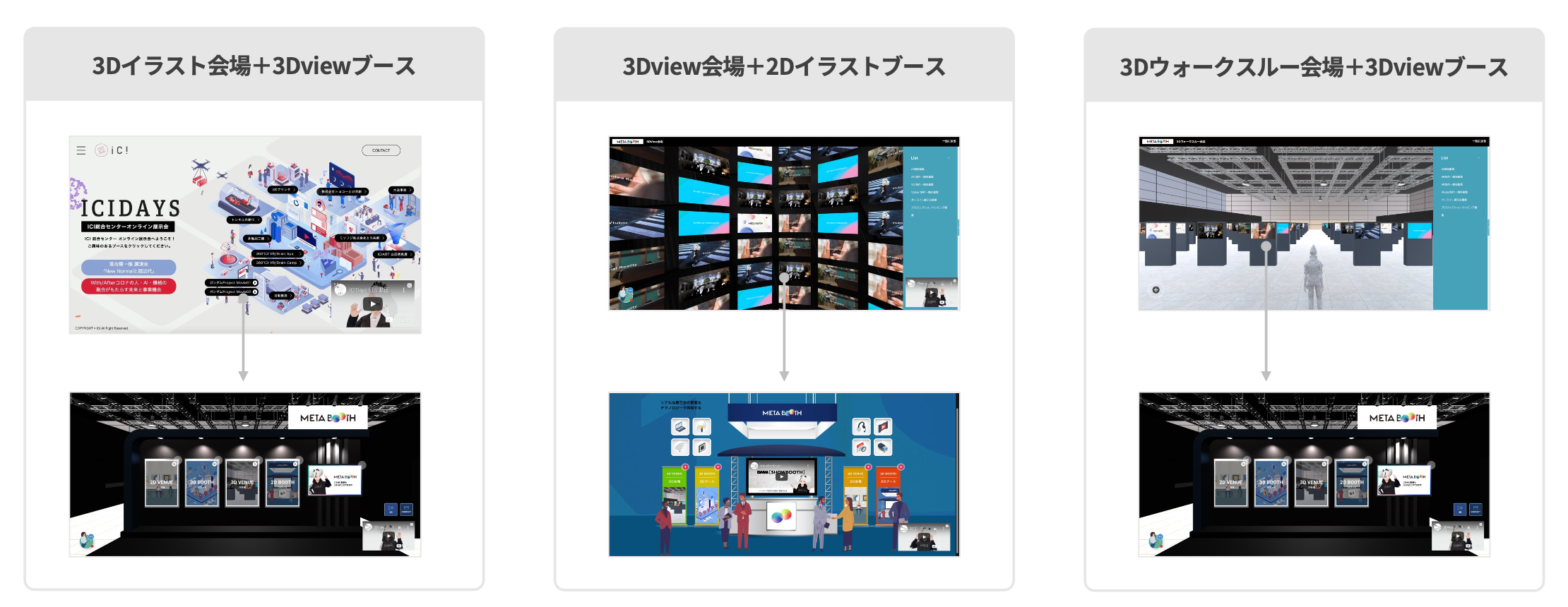 それぞれ単体での利用はもちろん、「3Dウォークスルー会場」+「2Dイラストブース」など、 ご要望に合わせた自由自在な組み合わせやカスタマイズもでき、オリジナリティの高い展示会の開催が可能です。