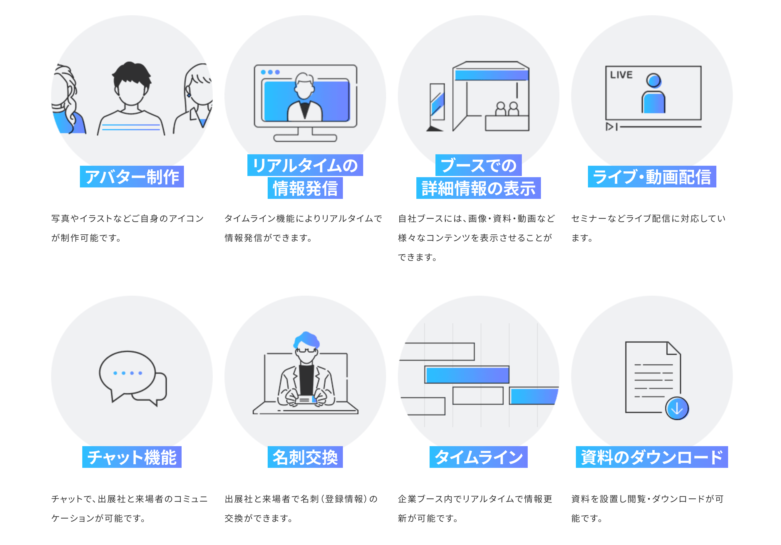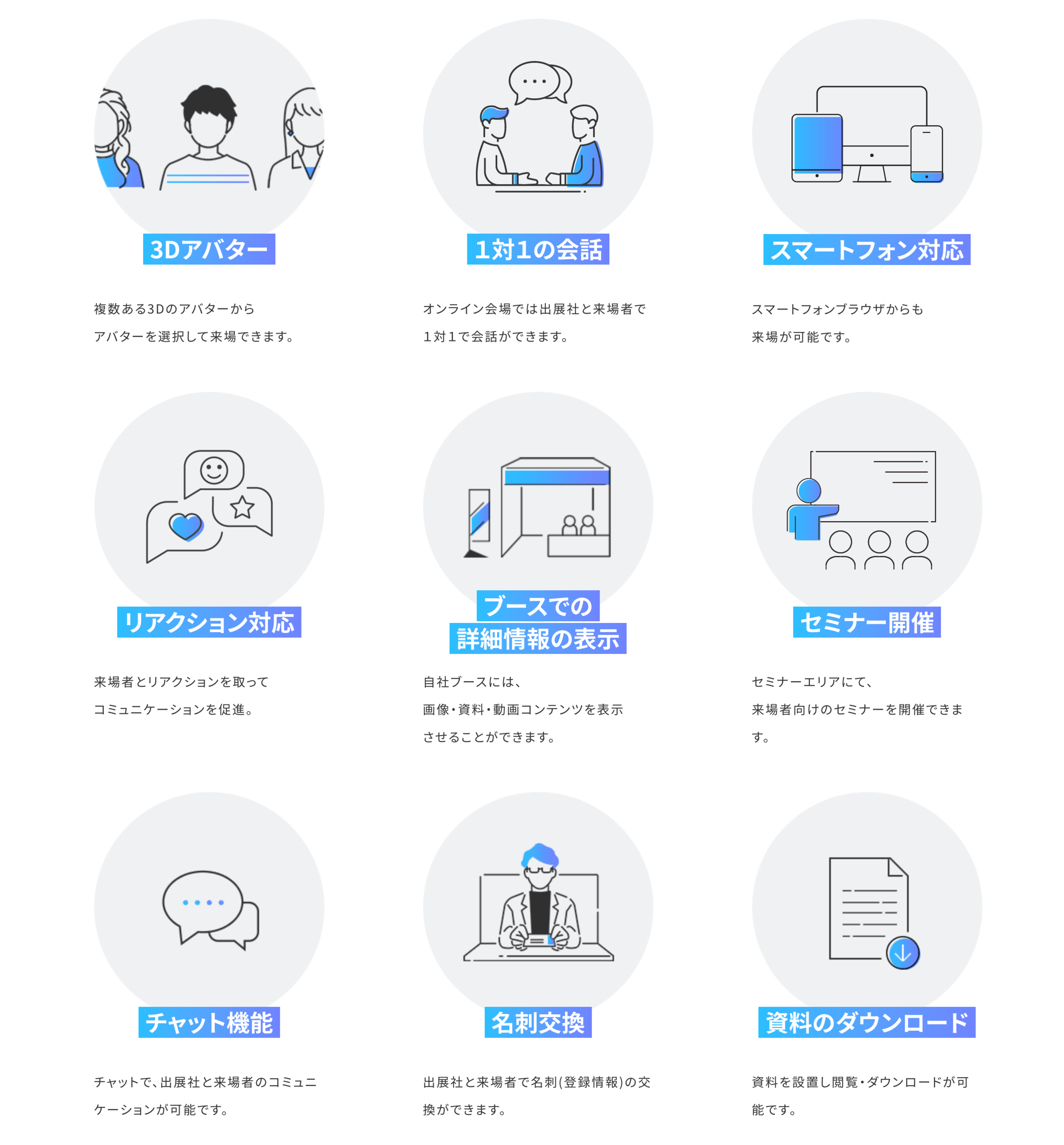 「テクノロジーで、イベントにイノベーションを。」をコンセプトに、臨場感を感じられる3D空間を活用した展示会や、イラストやアバターを活用した展示会など、オンライン展示会で課題となりやすい、参加者とのコミュニケーションの効率化とさらなる活性化を目指します。