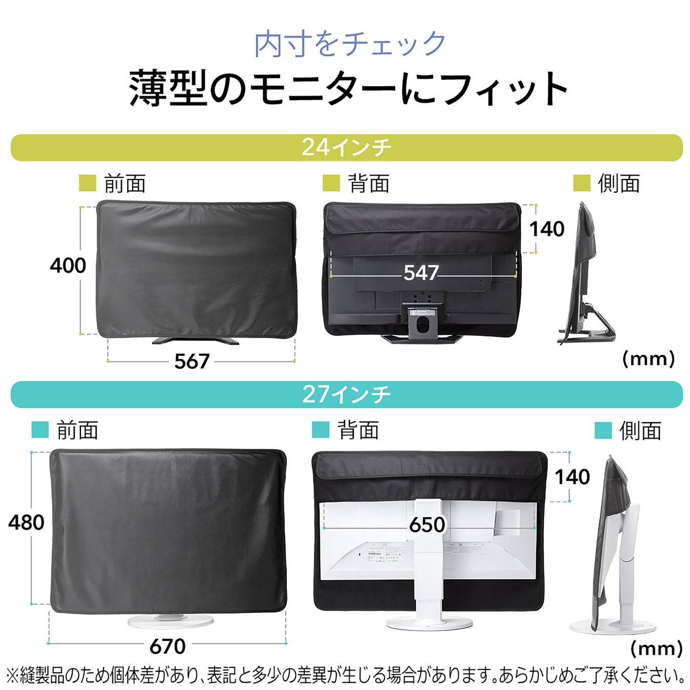 iMac24インチと27インチモニターにぴったり収まるサイズ、200-DCV043(24インチ):幅54.7cm以内、厚み1.5cm以内のモニター、200-DCV044(27インチ):幅65cm以内、厚み1.5cm以内のモニターに対応しています。